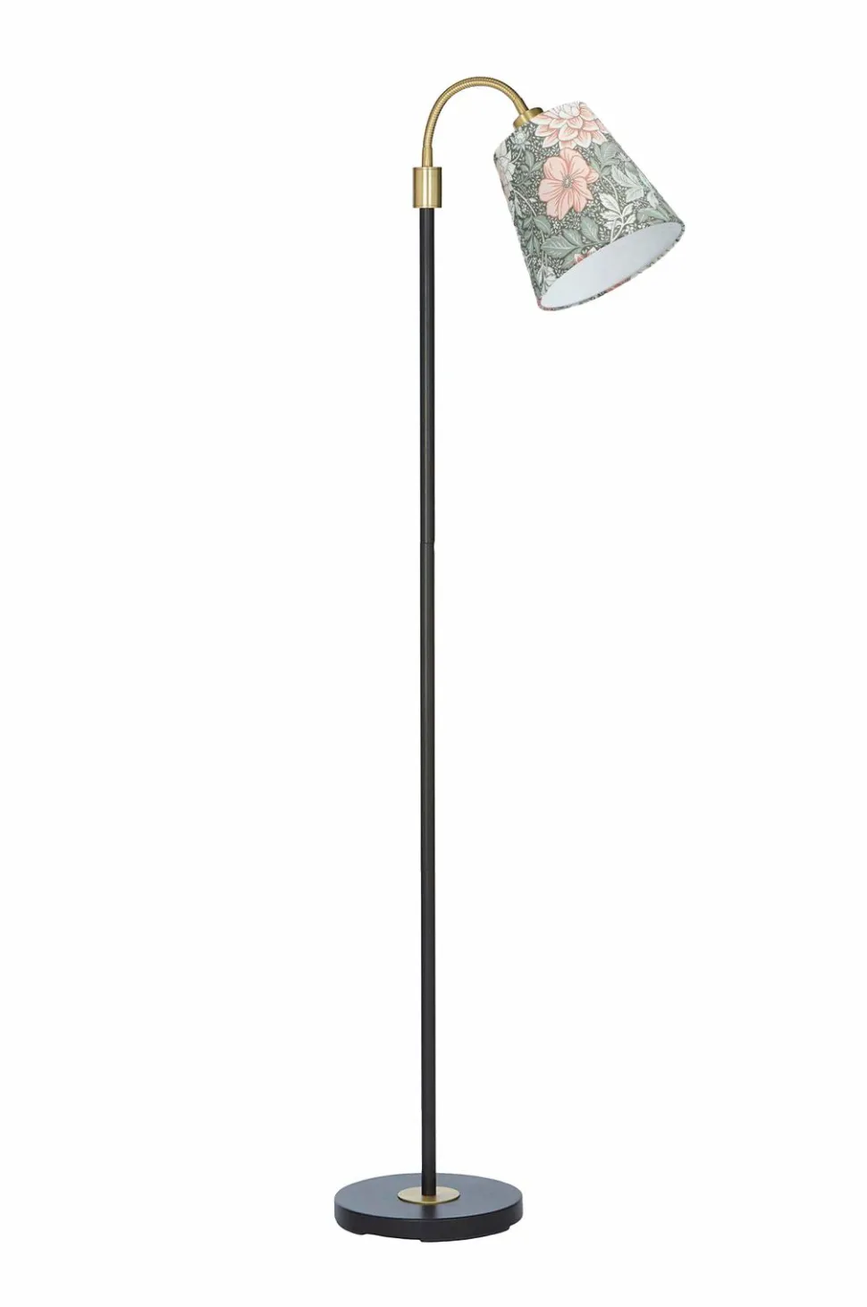 Gulvlampe amy flex i metal inklusive cia top fit-skærm. Skærmen har et mønster, i en rolig og beroligende farve, fra boråstapeter. Lampeskærmens mål: 20 cm i diameter forneden, 13 cm foroven og 19 cm i højden. E27 topmontering. Lampen leveres i knock-down-version og er nem at samle. Den øverste del af gulvlampen har en justerbar arm med e27-lampeholder, maks. 25w, hvor kontakten også er placeret. 190 cm lang ledning med vægudtag. Lyskilde købes separat. Højde 150 cm.