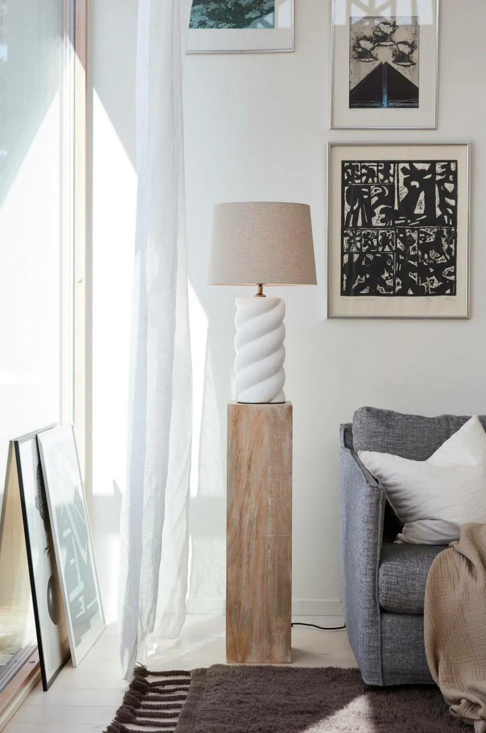 Lampefod Spin i keramik med et snoet design. 2 meter stofledning med strømafbryder ca. 20 cm fra lampen. Pære medfølger ikke. Passer med en skærm som er 30-35 cm i diameter.