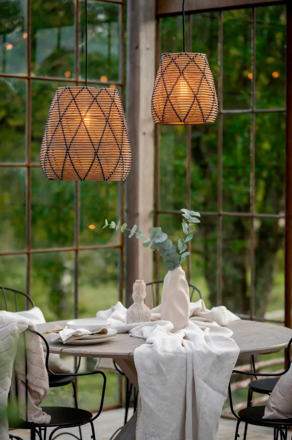 Lollo, en lille udendørsskærm i kraftigere kunstrattan flettet med et mønster. Kunstrotting er et robust materiale, som tåler vejr og vind. Den flettede struktur skaber et smukt lysspil. Kombineres med Flex Out loftophæng til udendørs brug.