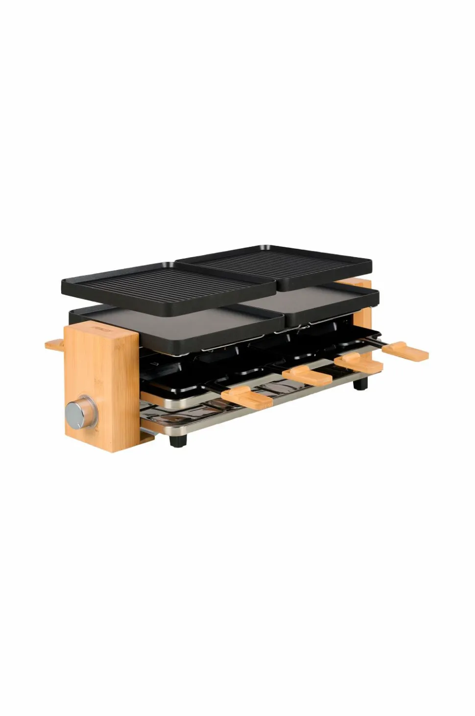 Raclette til op til 8 personer med raclettepander, der har non-stick belægning og ægte bambushåndtag.