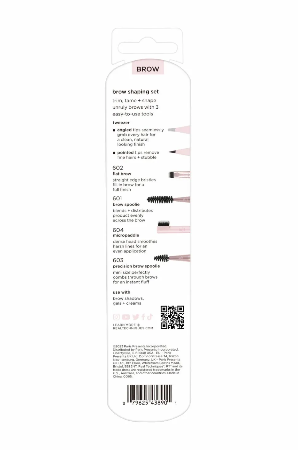 Opnå fantastiske øjenbryn med Real Techniques Brow Shaping Set . Denne set har 3 værktøjer med to ender til endeløs øjenbrynspleje. set indeholder en dobbeltsidet vinklet + spids pincet, en dobbeltsidet 601 spiral øjenbrynsbørste + 602 flad brow børste og en dobbeltsidet 604 micro paddle + 603 spiral præcisions øjenbrynsbørste. Du får 6 unikke værktøjer i dette 3-delte set, hvilket gør det perfekt til rejser eller til dit makeup-kit derhjemme. Brow Shaping Kit dækker hele plejerutinen, inklusive alle de nødvendige redskaber til at trimme, tæmme og forme uregerlige bryn. Pincetten fjerner uønskede øjenbrynshår, udfylder brynene med præcision og blander produkterne problemfrit. Værktøjerne fungerer bedst med øjenbrynspudder, -gel og -creme. Børsterne er lavet med forlængede aluminiumshylstre og 100 % grusomhedsfrie, veganske, UltraPlush-syntetiske børster.