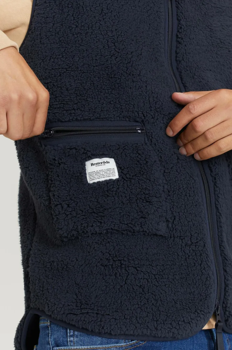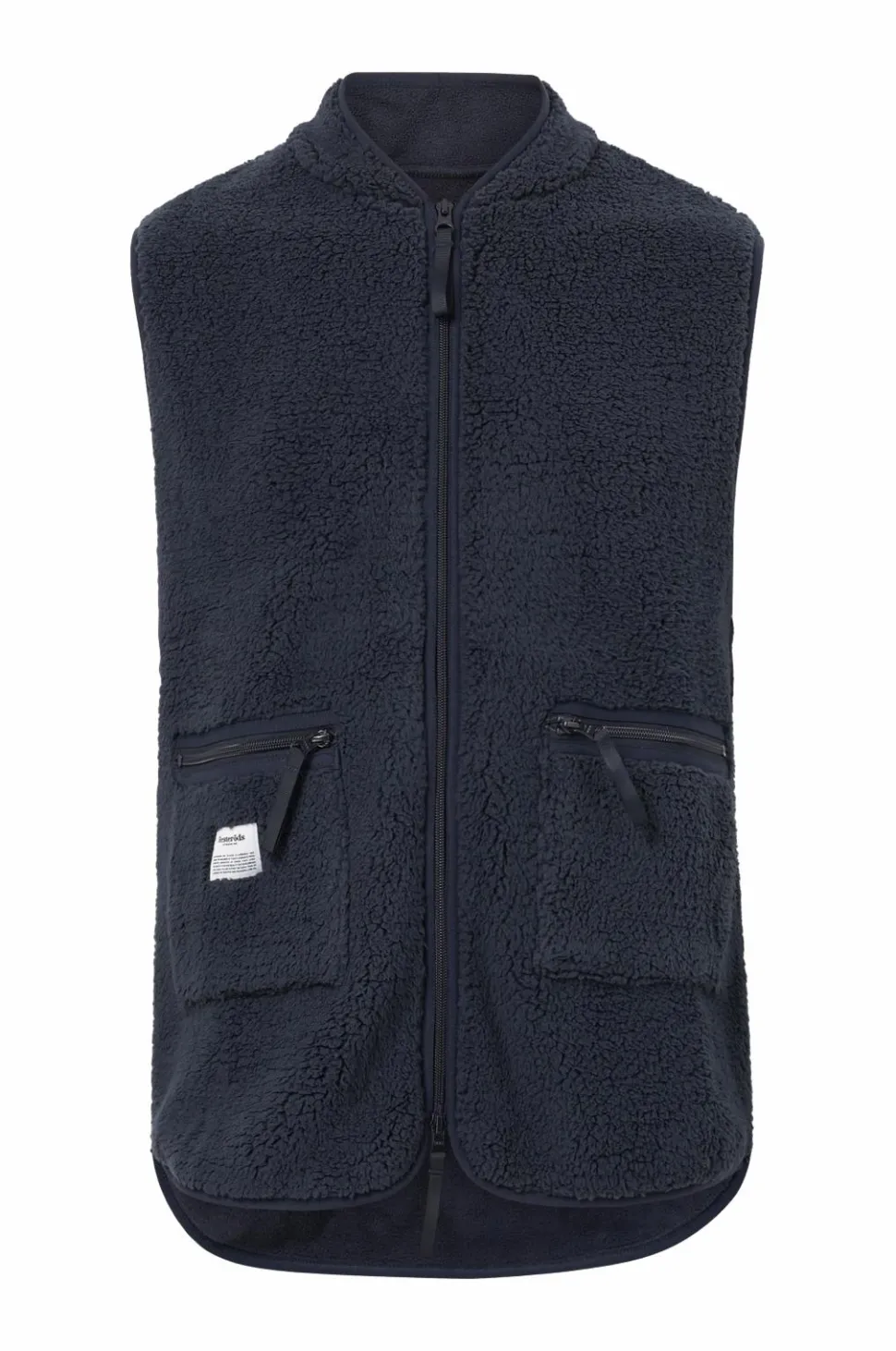 Klassisk fleecevest med lynlås og to lommer med lynlås. Længere bagpå. med afrundet kant forneden.