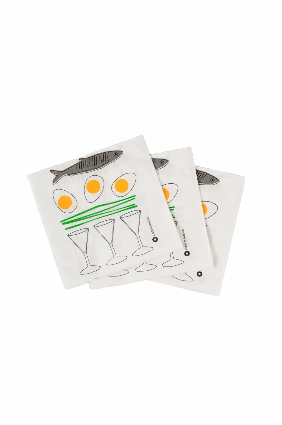 Servietter “herring, æg og snaps” – papirservietter med et legende og traditionelt mønster af herring, æg og snaps, perfekt til sommersammenkomster eller enhver lejlighed, hvor du ønsker at skabe en dejlig svensk atmosfære. Høj kvalitet og blød tekstur giver den bedste oplevelse.