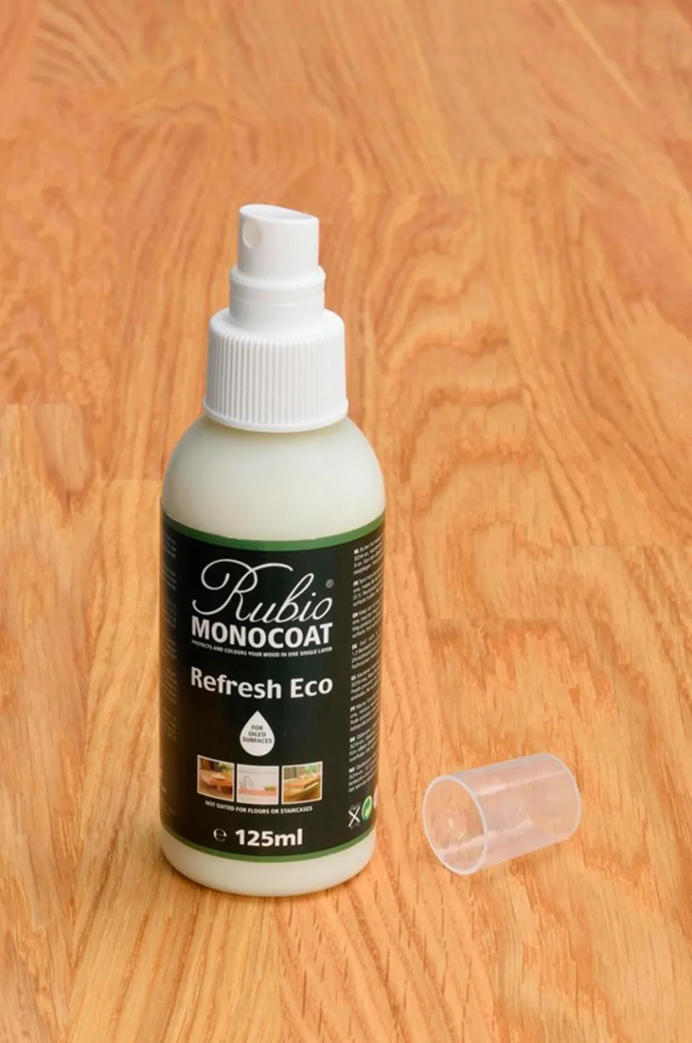 RUBIO Monocoat Refresh Eco 125 ml sprayflaske er et færdigblandet produkt, der opfrisker og restaurerer alle træoverflader, der er behandlet med olie. Pigmentfri emulsion, der kan bruges flere gange om året.