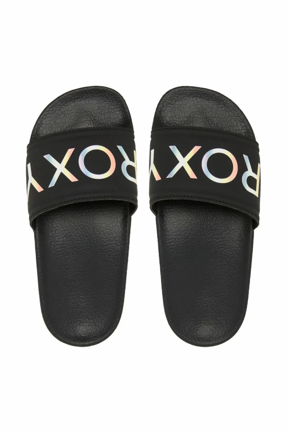 Badesandaler RG Slippy II fra Roxy med formet fodseng og bred, let vatteret rem med sølvfarvet logo over foden.