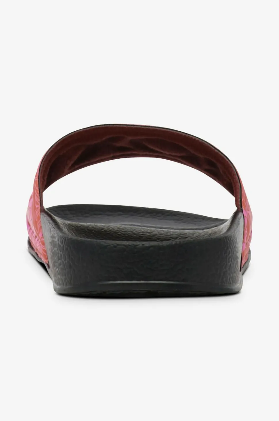 Badesandaler RG Slippy II fra Roxy med formet fodseng og bred, let vatteret rem med sølvfarvet logo over foden.