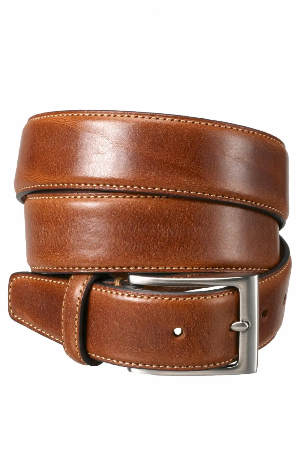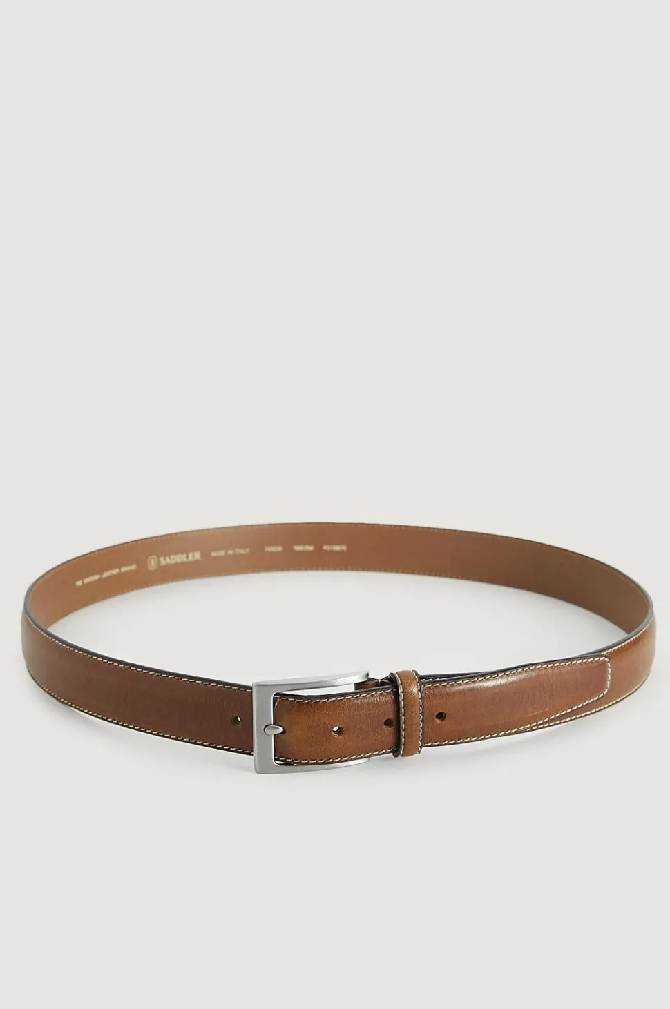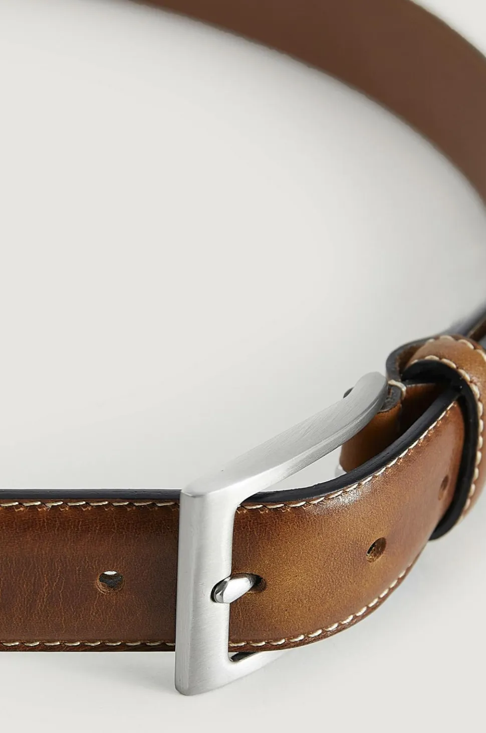 Fint bælte af skind med skindfor. Søm langs kanten. Spænde i sølvfarvet metal.