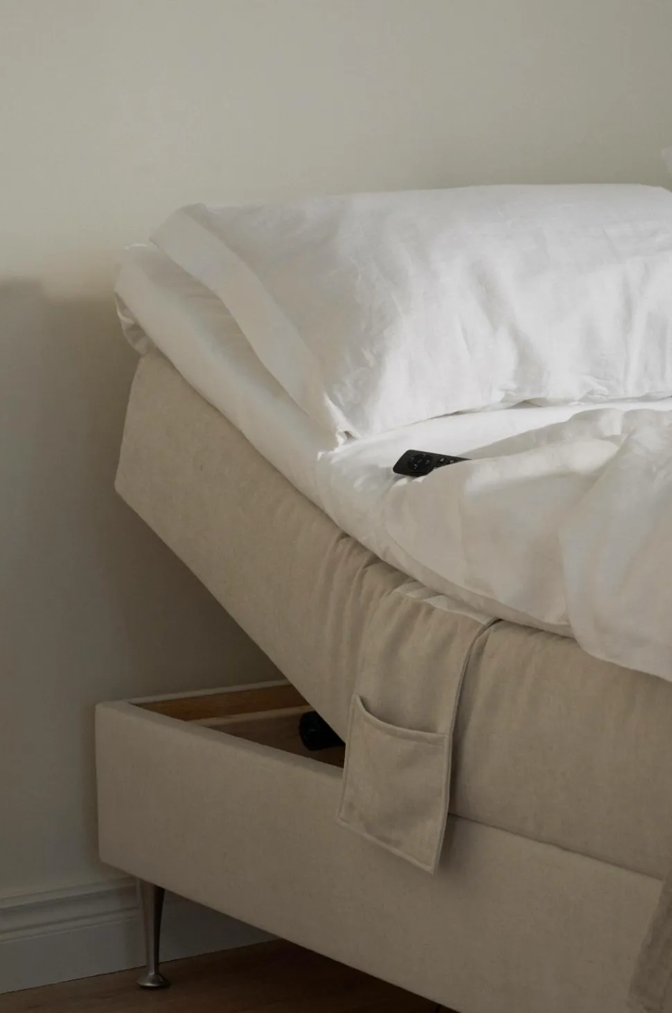 Den justerbare seng LUNA består af en chesspocket-kassette, hvor hver anden spiral er 16 cm høj, og hver anden er 18 cm høj. Det giver en blød og hyggelig følelse. Fordelen ved at vælge en justerbar seng er, at du kan justere hoved- og fodende, så du kan finde den rigtige position til din krop. Hvis du kan lide at se tv i sengen eller læse, kan du nemt hæve hovedgærdet. Sengen kan styres via en app på din telefon. Du kan indstille en hukommelsesfunktion, når du har fundet den stilling, der passer bedst til din krop. Rammen er lavet af massivt træ. Sengemadrassen består af en kerne af hyperblødt skum, der er omviklet med 4-kanals hulfibervat, som leder fugt og varme væk. Topmadrassen er piqué, hvilket betyder, at betrækket ikke kan tages af, men det skaber en overfladeblød fornemmelse. Benene er af metal i et elegant design, højde 19 cm.