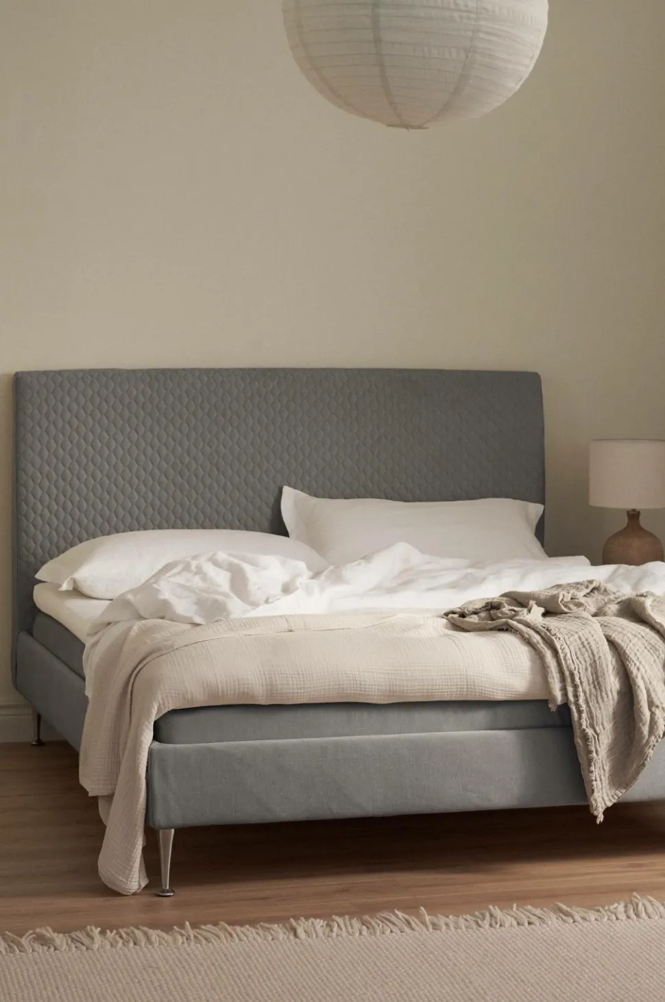 GÅVA, sengen designet til et helt liv – konstruktionen giver en lang række muligheder for at ændre komfort og stil. En Softbed er en seng med indbygget hovedgærde, hvor du kan vælge din komfort. Alt sammen for at passe til din livsstil. At kunne opgradere, renovere og reparere din seng er en vigtig bæredygtig forpligtelse, da det forlænger din sengs levetid. Designet giver dig også mulighed for at genbruge din seng. Vi tilbyder 25 års garanti på fjederbrud. Sengen består af en ramme lavet af gran, der er dækket af et blødt stof af 100 % polyester. Kassetterne er en 17 cm høj 3-zonet lomme. Du får ekstra støtte i midten, hvor kroppen er tungest, samtidig med at skuldre og nakke aflastes. Benene er af metal i et elegant design, 19 cm. Topmadras, piqué med en kerne af hyperblødt skum, omviklet med 4-kanals hulfibervat, der leder fugt og varme væk. Madrassen er piqué, hvilket betyder, at betrækket ikke kan fjernes, men det skaber en blød overflade.
