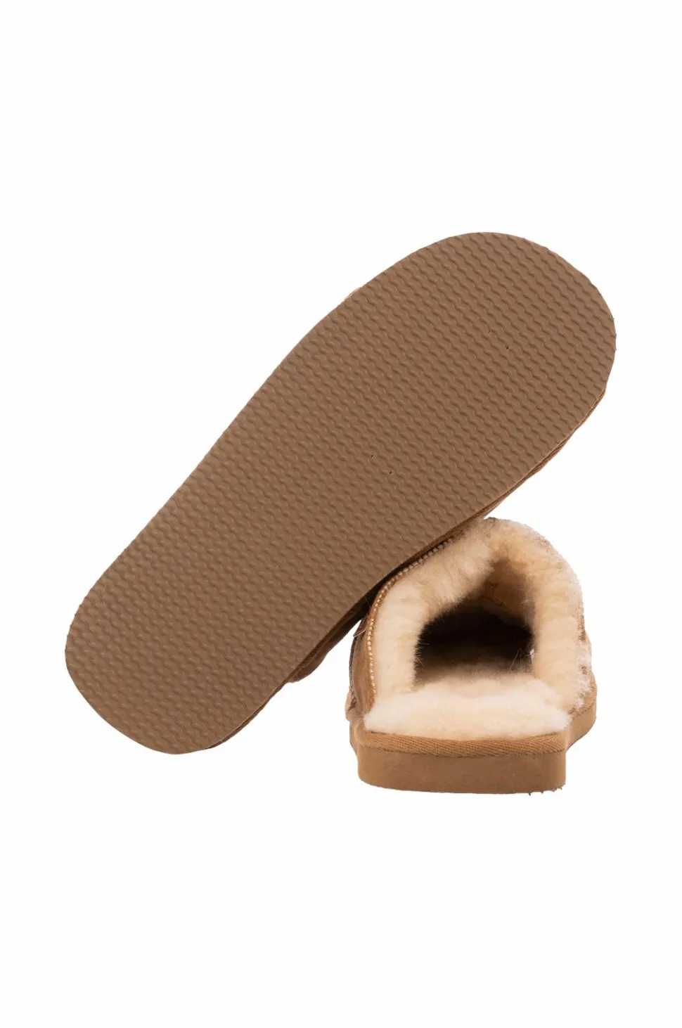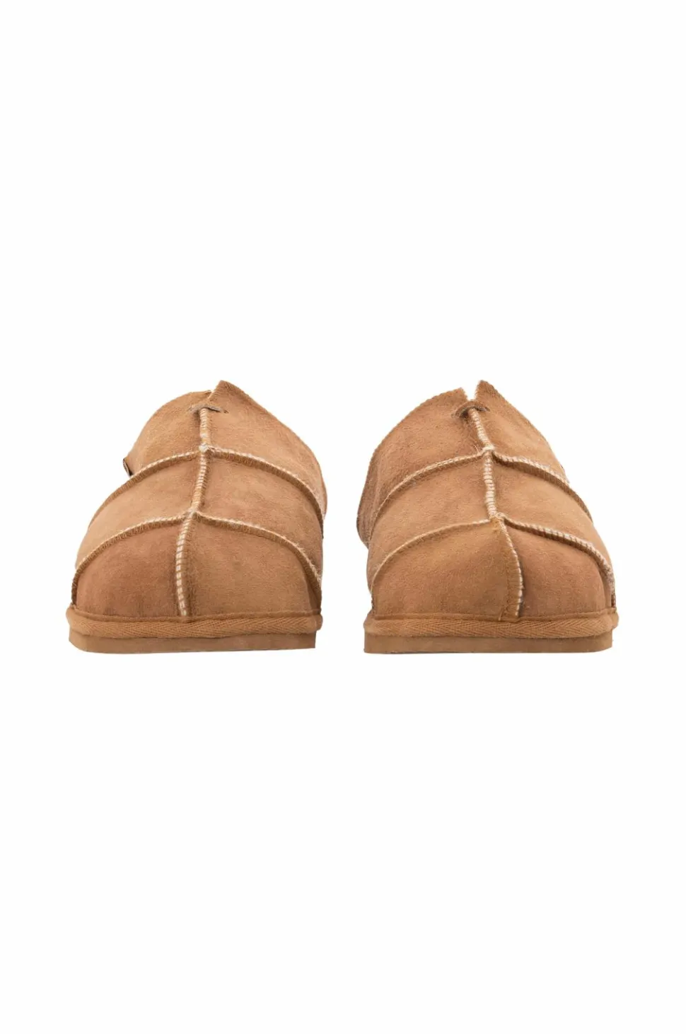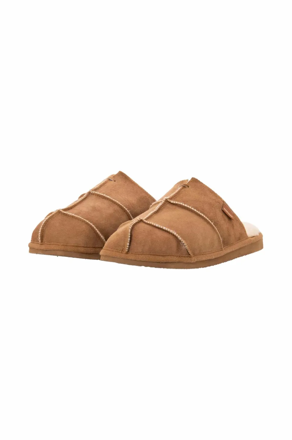 Shepherd allan. Et par bløde hjemmesko lavet af patchwork i et klassisk slip-on-design. De har dekorative overfladesyninger med stofbånd omkring sålen. Ydersålen er lavet af eva.