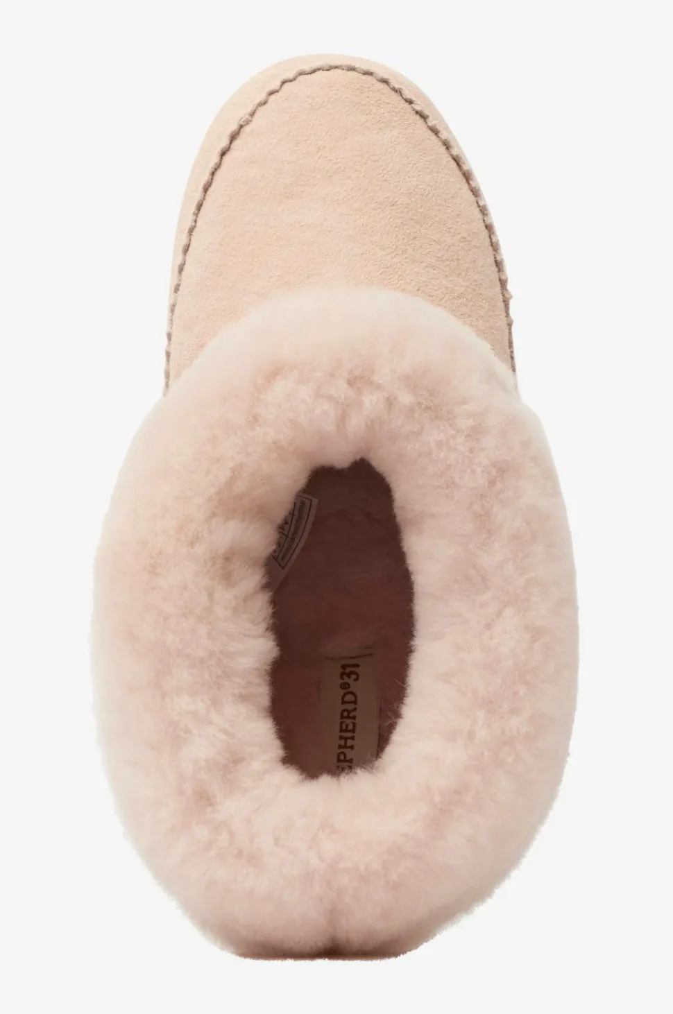 Fåreskindshjemmesko Piteå fra Shepherd i klassisk model med bred fåreskindskrave og dekorative sømme. Blød sål i ruskind.