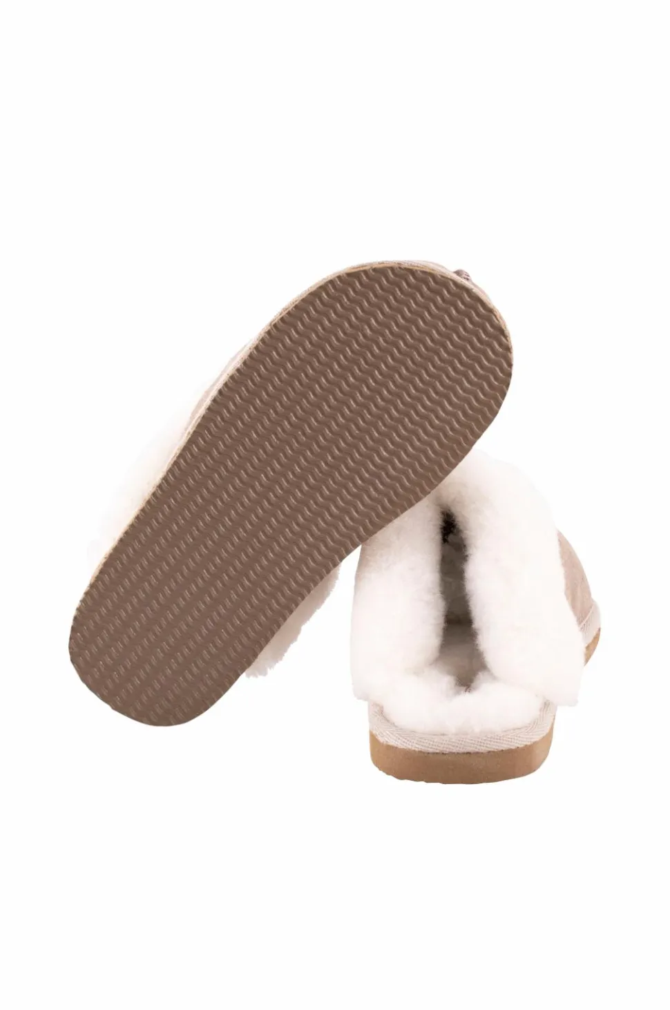 Shepherd Åre er et par børnetøfler i slip-on-model lavet af fåreskind. Hjemmeskoene har en dekorativ udvendig søm foran og en bred krave af fåreskind. Tekstilkant rundt om sålen. Ydersål i eva.