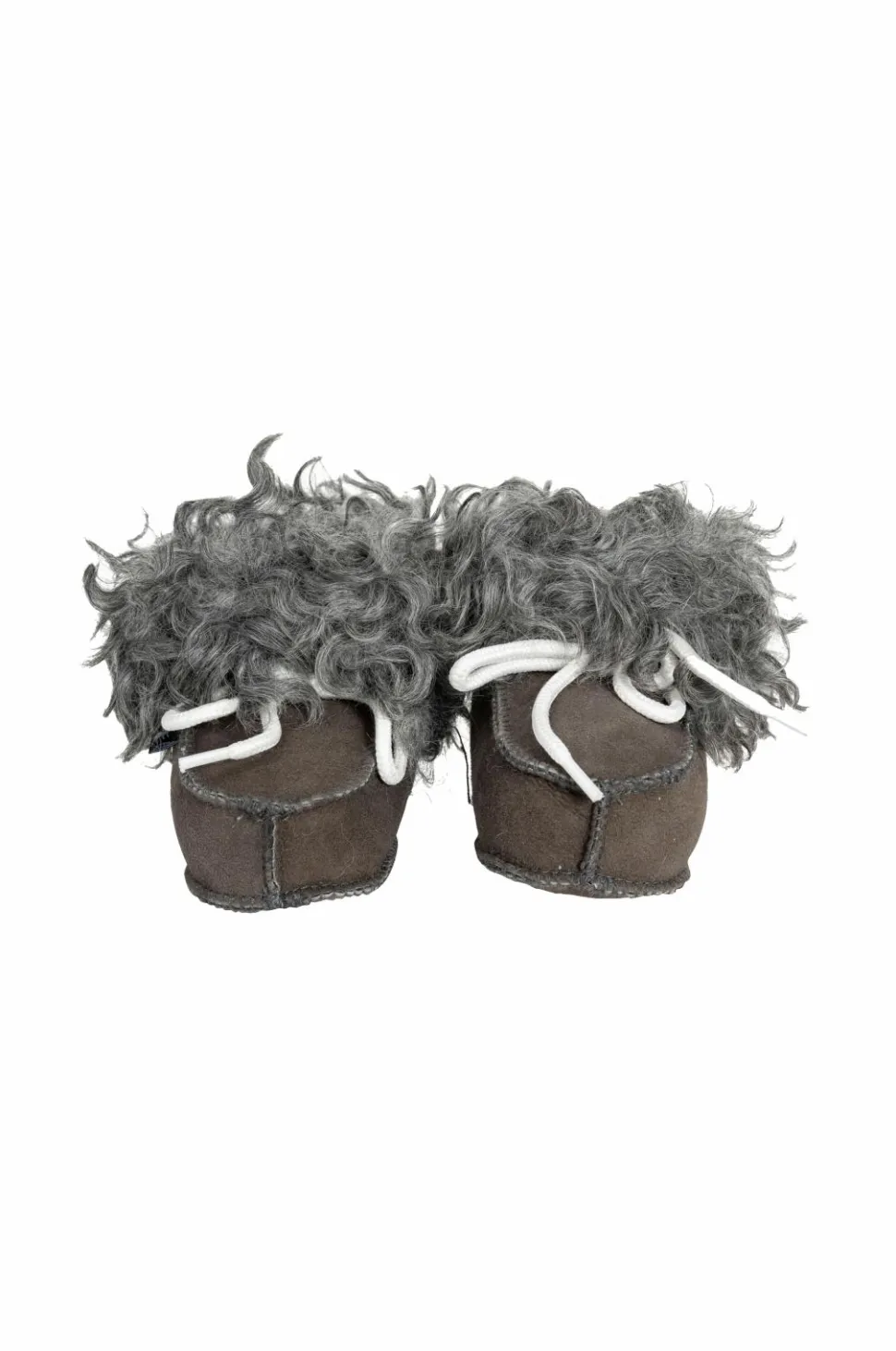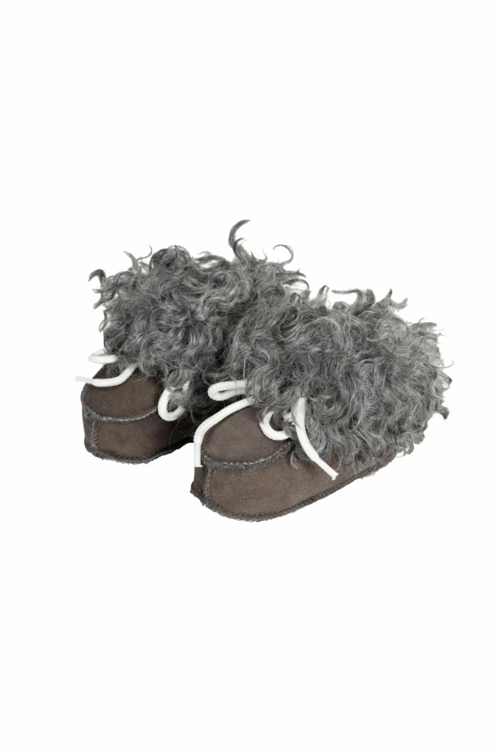 Shepherd rone. babytøfler med snørebånd. Disse ankelhøje hjemmesko har en bred krave i ægte gotlandsk uld, der er kendt for sine unikke krøller og blanke struktur. blød ruskindssål.