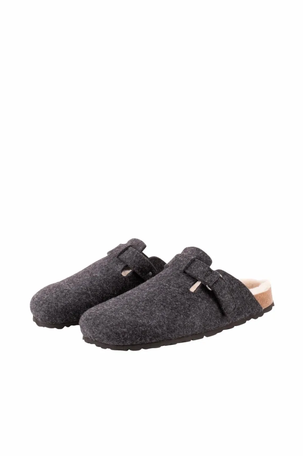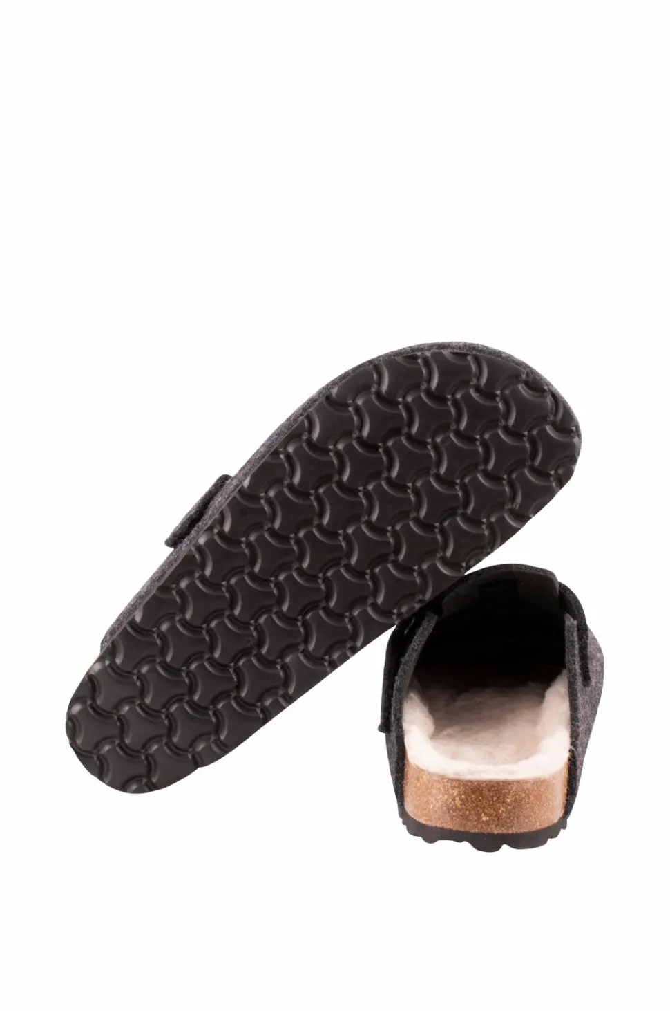 Shepherd Valdemar. Et par sandaler i blød uld. Sandalerne har brede remme med velcrolukning. Den fodformede korksål er dækket af fåreskind. Eva-ydersål giver en let og polstret sandal.