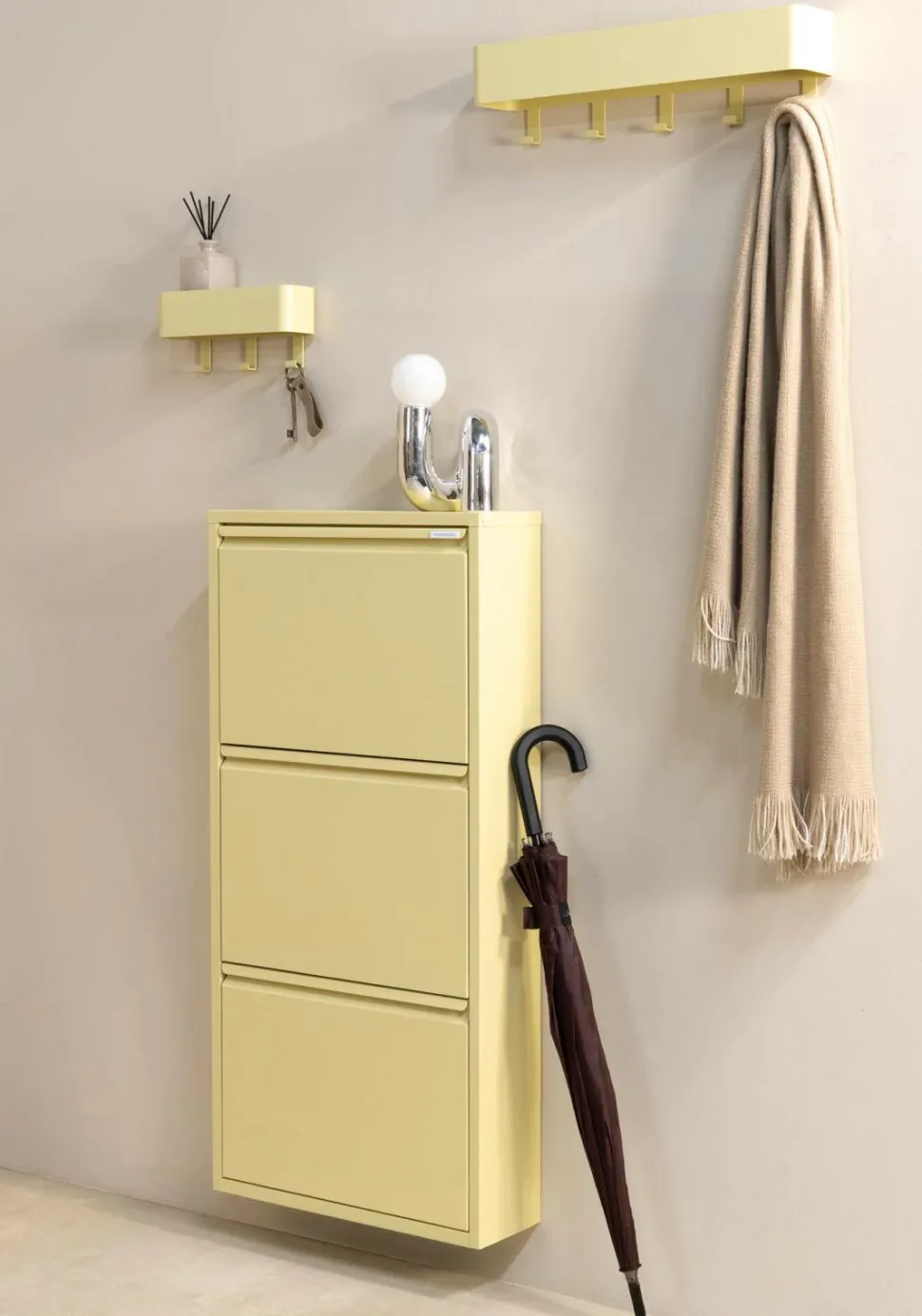 Med et slankt, lavt design i pulverlakeret stål er Billy 3 skoskabet et stilfuldt svar på et almindeligt problem: sko, der ligger og flyder. Et multifunktionelt skoskab, der fås i flere størrelser, og som er et praktisk blikfang både på gulvet og på væggen. Billy 3 har plads til ca. 6 par sko og fås i flere farver.