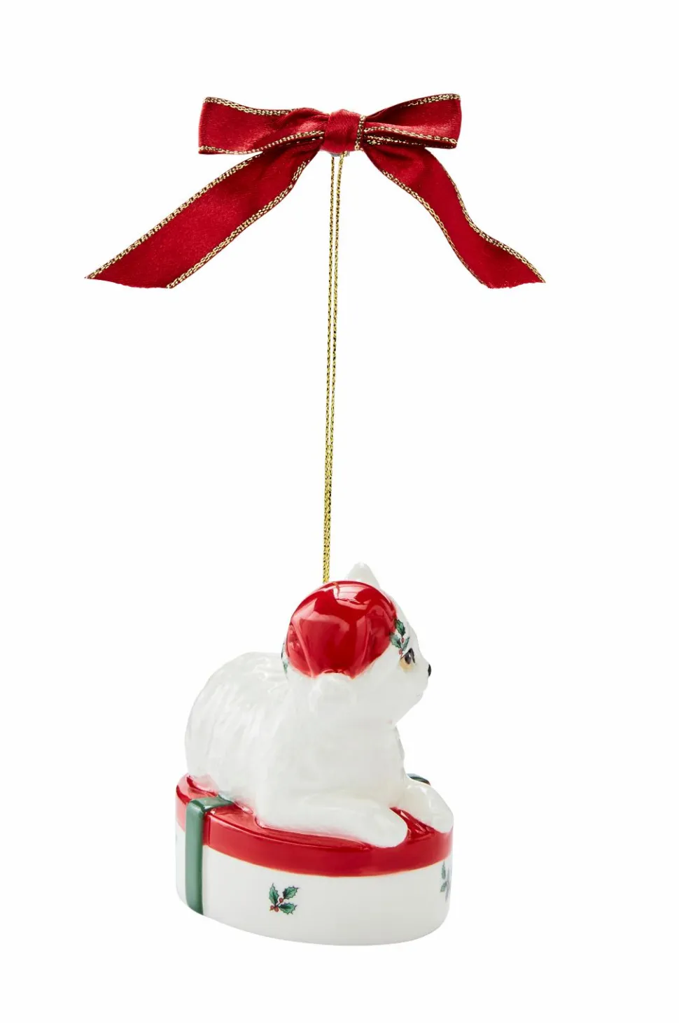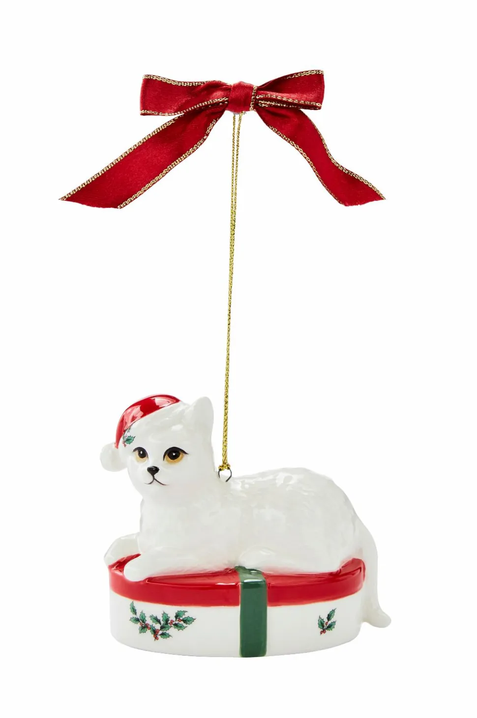 Hæng stolt denne smukke kattekilling i gaveæske på dit træ. Dekorationen er en del af Spodes juletræskollektion og forestiller en kattekilling, der sidder oven på en julegave med sløjfe. En betænksom gave til en katteentusiast.