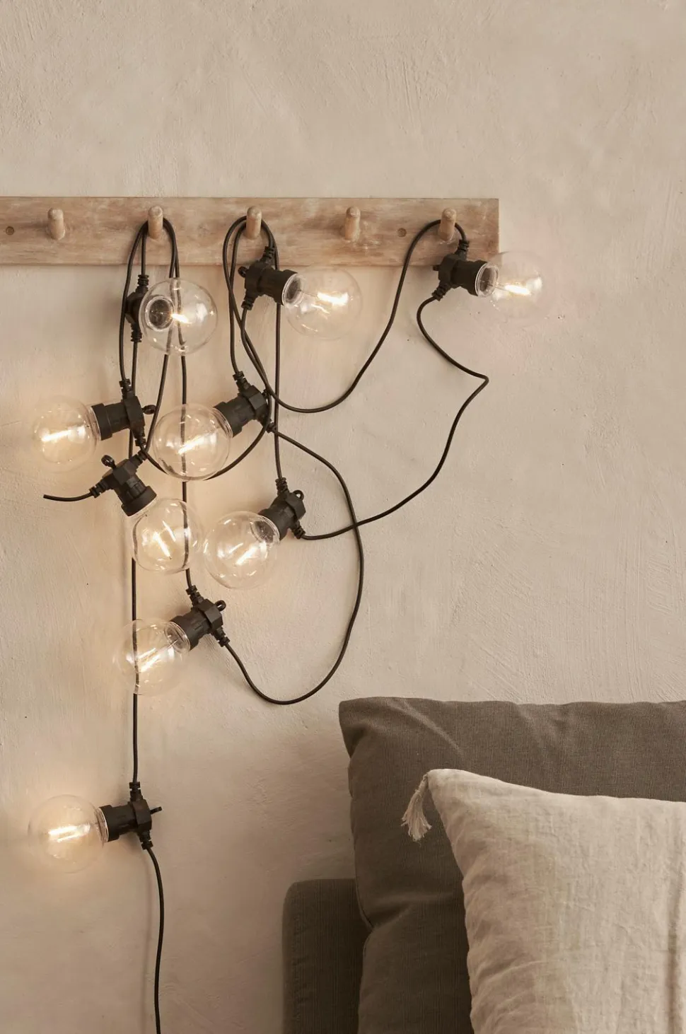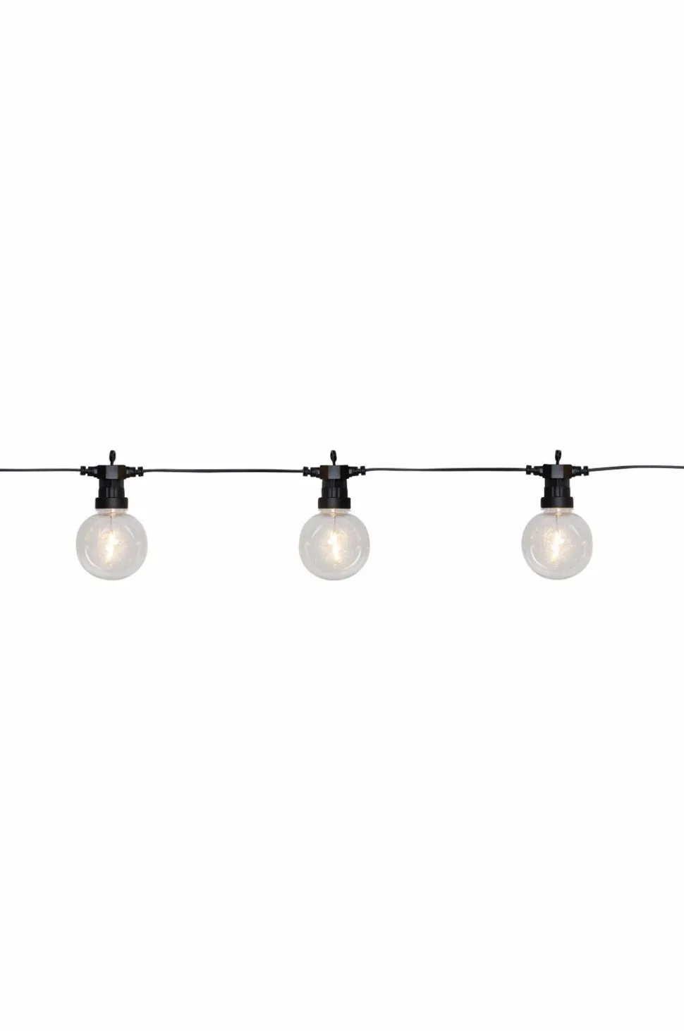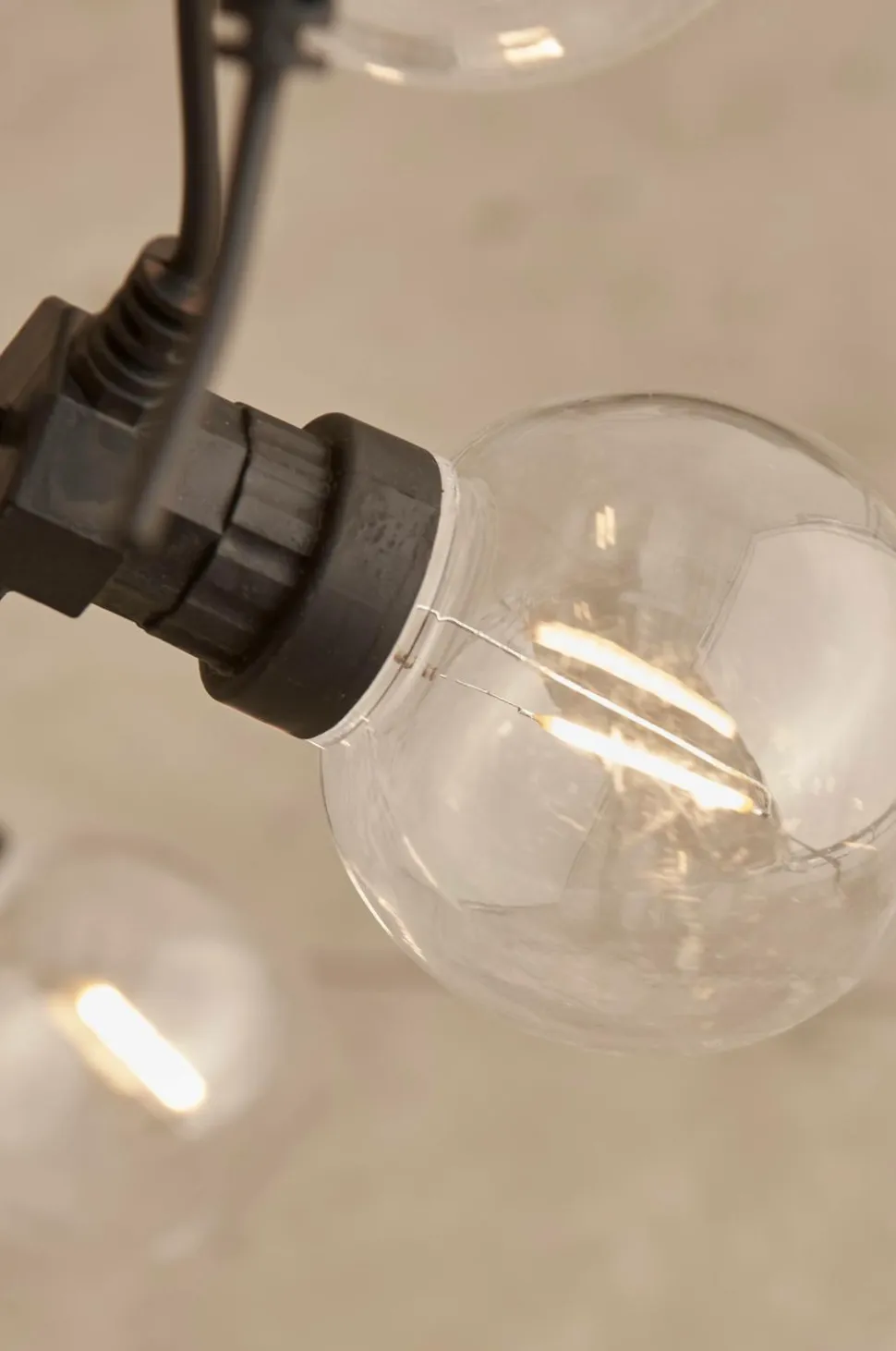 Flot partylyskæde i gummi, med filament, til dekoration både til hverdag og fest. Varmt hvidt lys skaber et skønt lysskær i mørket. Kædens længde er 450 cm, pærerne er 14 cm høje (inkl. “sokkel”) diameter 8 cm. Tilslutningskablet er sort med en længde på 500 cm. Kæden kan bruges både indendørs og udendørs. Transformer medfølger. Forventet levetid 10000 t. 10 integrerede led-lyskilder medfølger (ikke udskiftelige). Pærens effekt (W):0,26. IP44. Filamentet er udformet til at ligne trådene i en klassisk glødepære, således at dit armatur får et effektfuldt look.