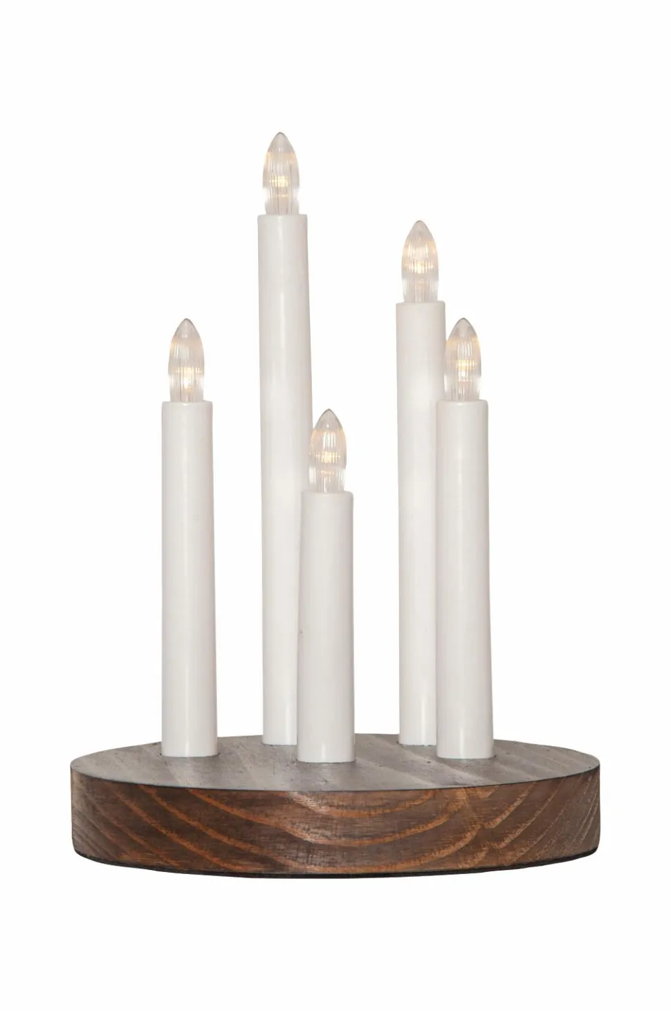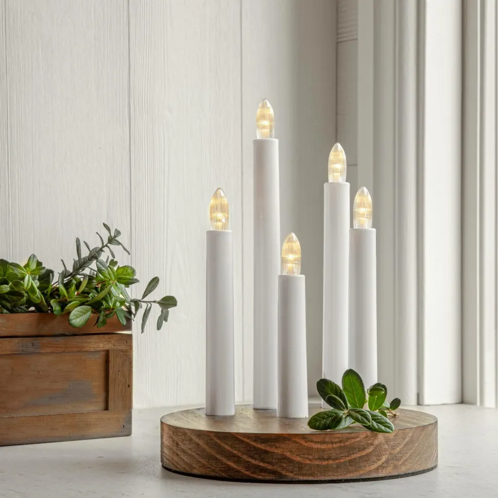 Batteridrevet adventslysestage af træ. Lysestagen er lille og fin og derfor nem at placere i både vinduer og på en skænk. Led-lys, der skinner flot og skaber julestemning i hjemmet.