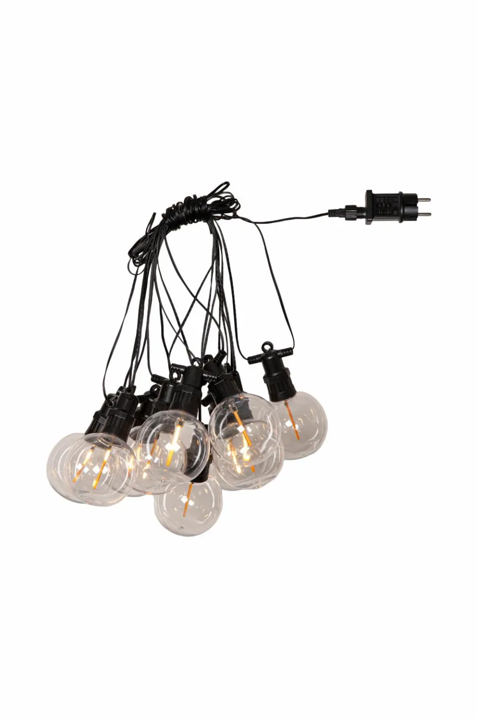 Lyskæde til udendørs brug, 10 klare kugler på 8 cm i diameter med en glødetrådsstang med flydende lyseffekt, varmt hvidt skær, der giver et behageligt lys. Velegnet til både hverdag og fest. Sort kabel med 50 cm mellem hver kugle.