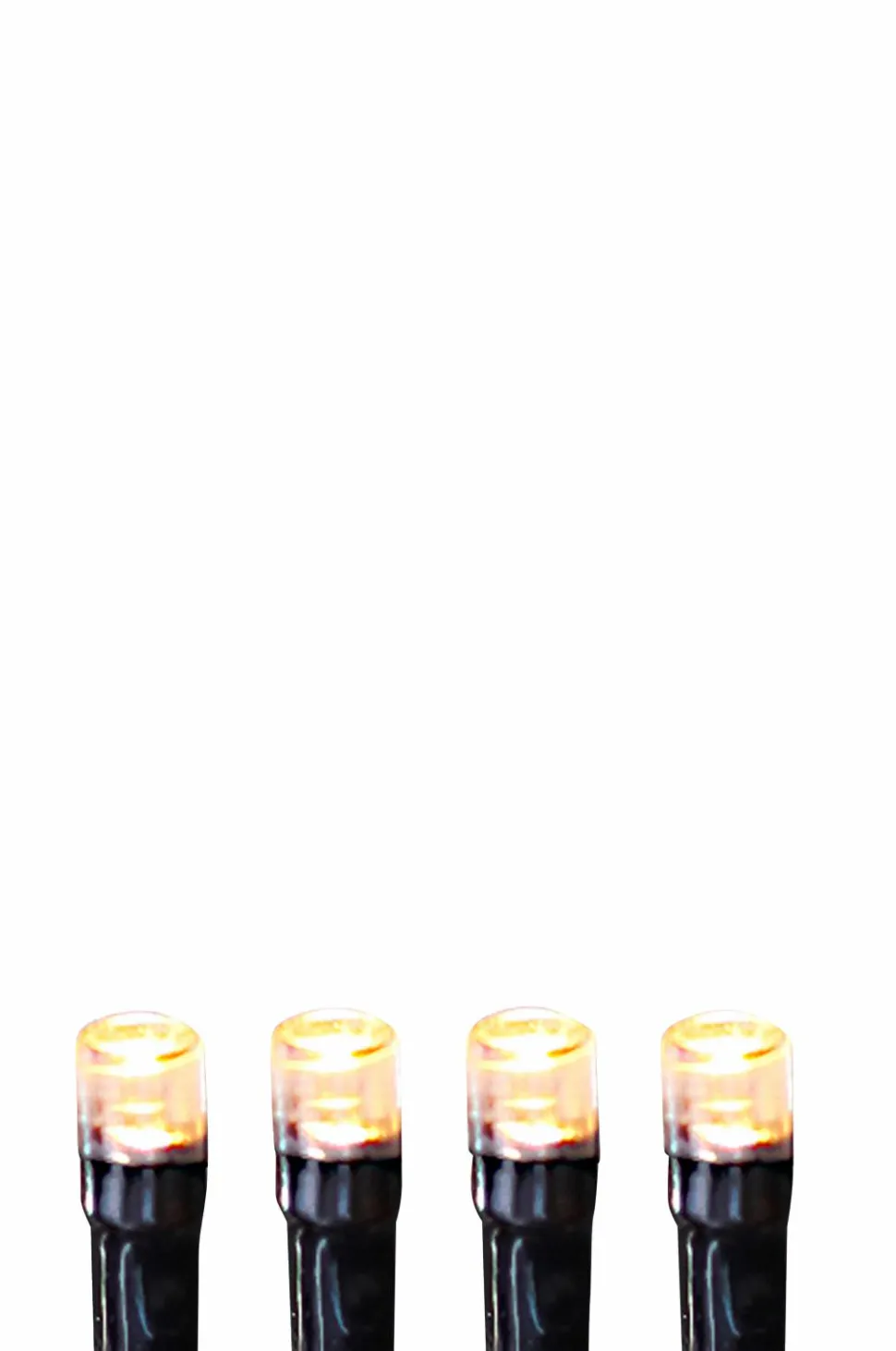 Serie Micro LED lyskæde med sort kabel og 3 mm LED punkt. Lyskæden er 18 meter lang og har 180 LED-lyskilder med varmt hvidt skær. Smuk lyskæde til at pynte op med udendørs. Gennemsnitlig levetid 500 timer.