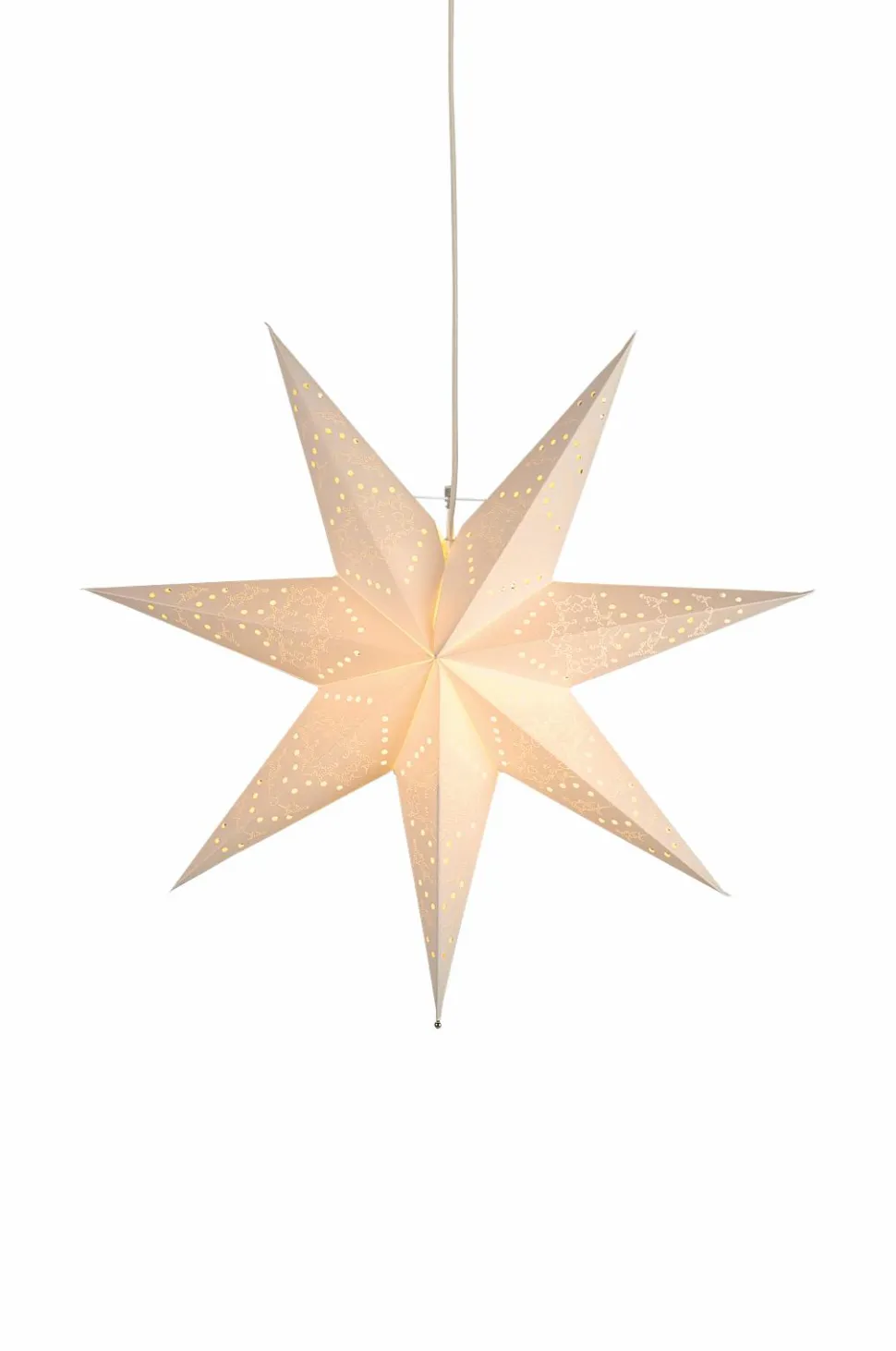 Mønstret papirstjerne i hvidt design En dekorativ stjerne til ophængning i vinduet. Højde 51 cm, bredde/længde 54 cm og dybde 16 cm. E14-fatning, pærer medfølger ikke. Hvid ledning, 350 cm. Maks. effekt 25W.