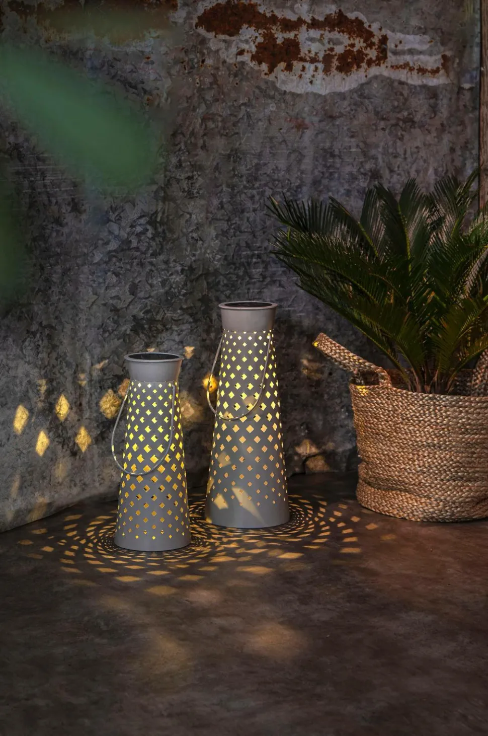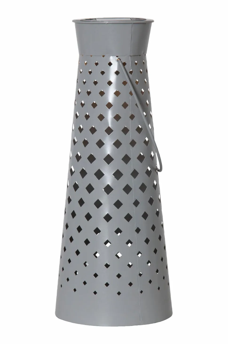 Vores fine lanterne Romby er en solcellebelysning lavet i gråt metal. Det varme hvide lys skinner smukt gennem det udstansede rombemønster og danner et smukt lysbillede. Lygten er fin at stille i din have eller på en altan. Placer den, hvor solen kan nå panelerne i løbet af dagen for at få den ultimative opladning af det medfølgende batteri.