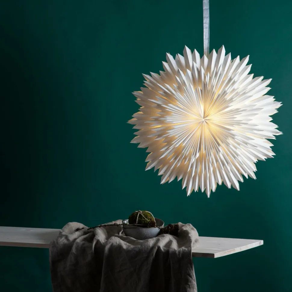 Fantastisk hvid papirstjerne lavet af tre lag krøllet papir. Konturen er lidt ujævn for at give en vinterlig fornemmelse. Der medfølger et elegant bånd, som gør det lettere at hænge stjernen op. Stjernen spreder stemning og giver hjemmet den særlige julestemning. Kan hænges både foran og op ad en væg. Dette produkt er fsc®-certificeret. Kombiner med en ledning efter eget valg.