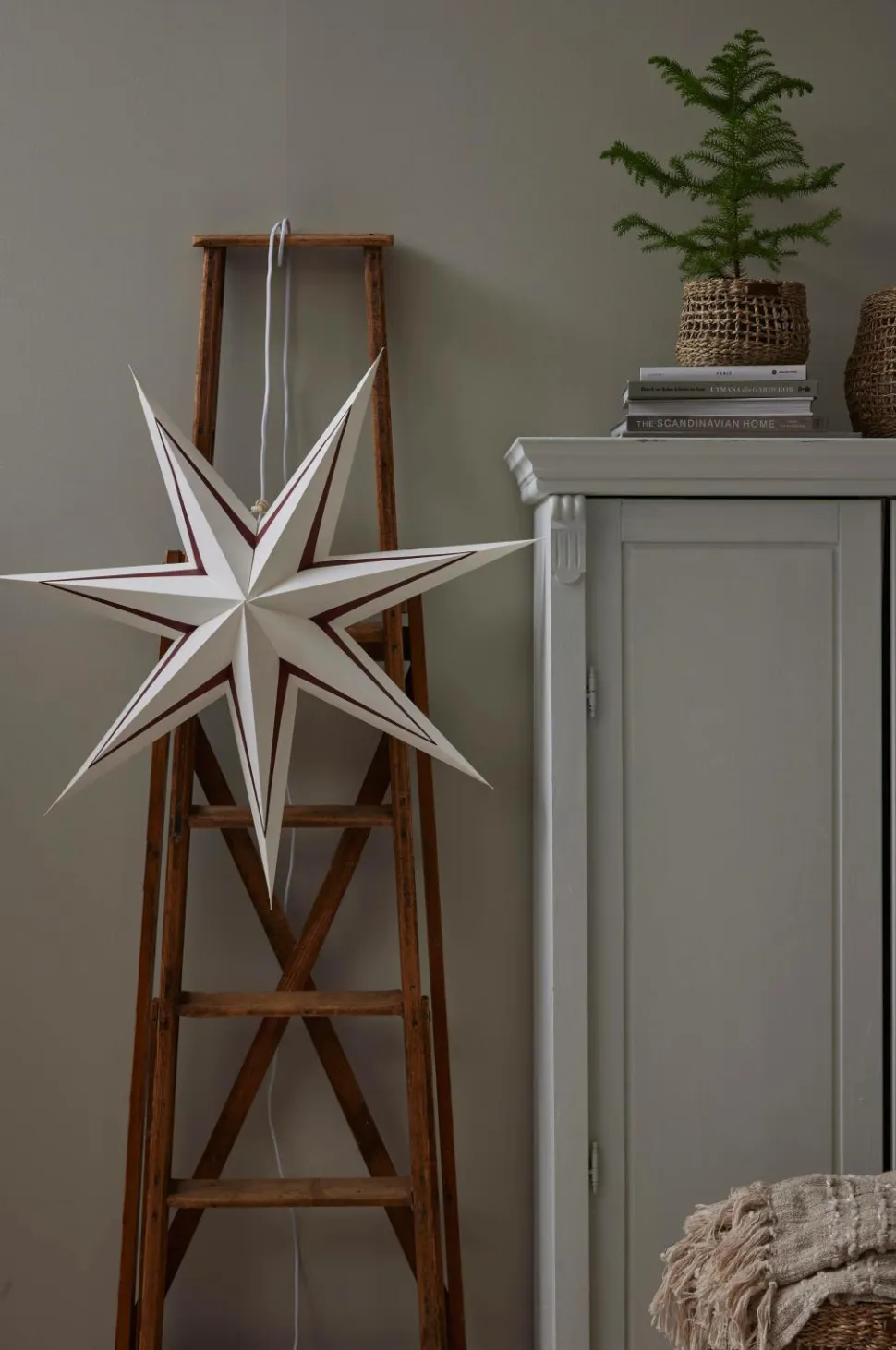 Stribet stjerne lavet af papir. Klassisk hvid stjerne med striber. Pynt op til advent, og det vil give en vidunderlig julestemning. Køb et ledningsstativ og en lyskilde til at lyse stjernen op.