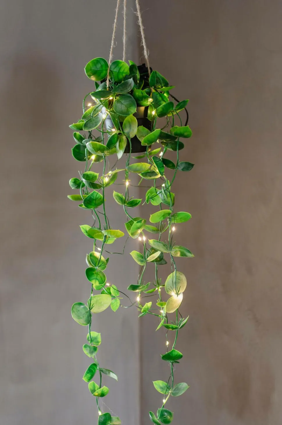 Dekorativ kunstig plante med dugdråbe-lyskæde, 35 varmhvide lyspunkter giver en flot glød. Perfekt grønt til hjemmets lidt mørkere hjørner, også velegnet udendørs, da batteriboksen er beregnet til udendørs brug. Sort plastikpotte med jutesnor til nem placering, hængende eller stående.