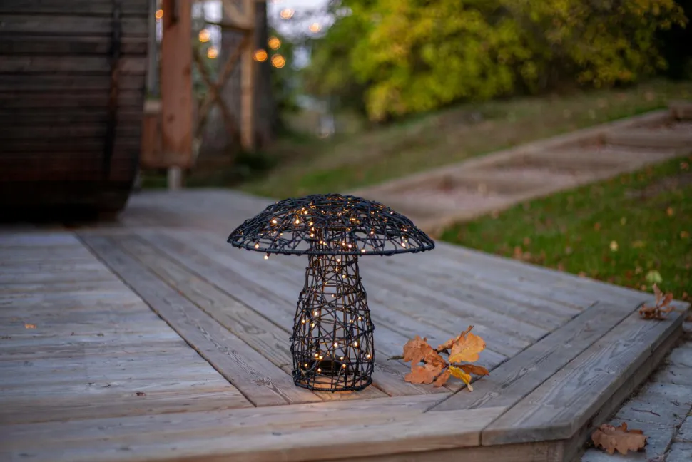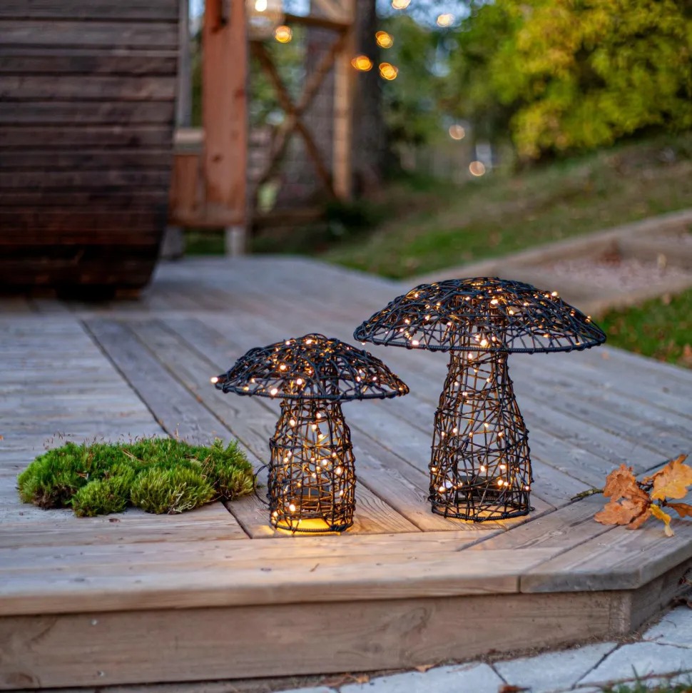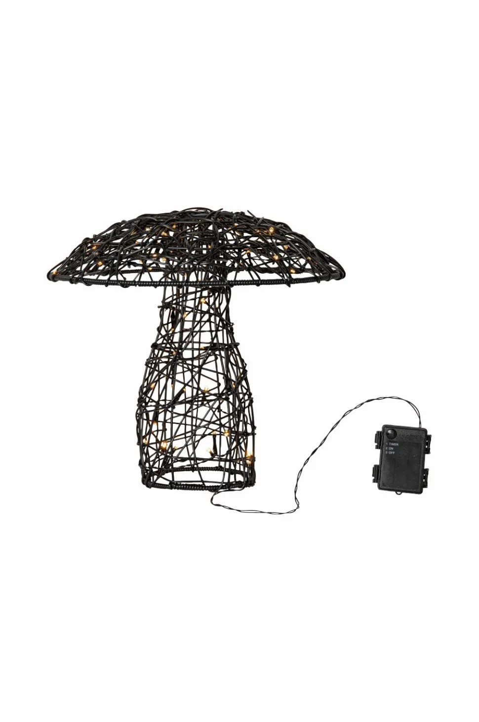 Batteridrevet udendørs dekoration i form af en svamp, 34 cm høj. Fremstillet af sort rattan med metalramme. Batteriboksen drives af 3 stk. aa-batterier (medfølger ikke). En smuk dekoration til terrassen og haven.