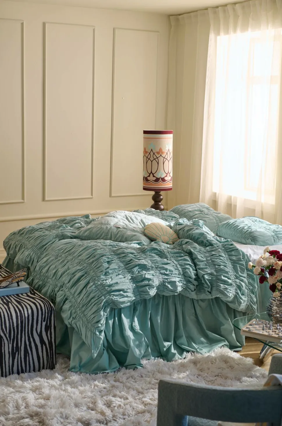 • Forsiden af dynebetrækket og pudebetrækket har en blød elastik, som giver en dekorativ effekt.