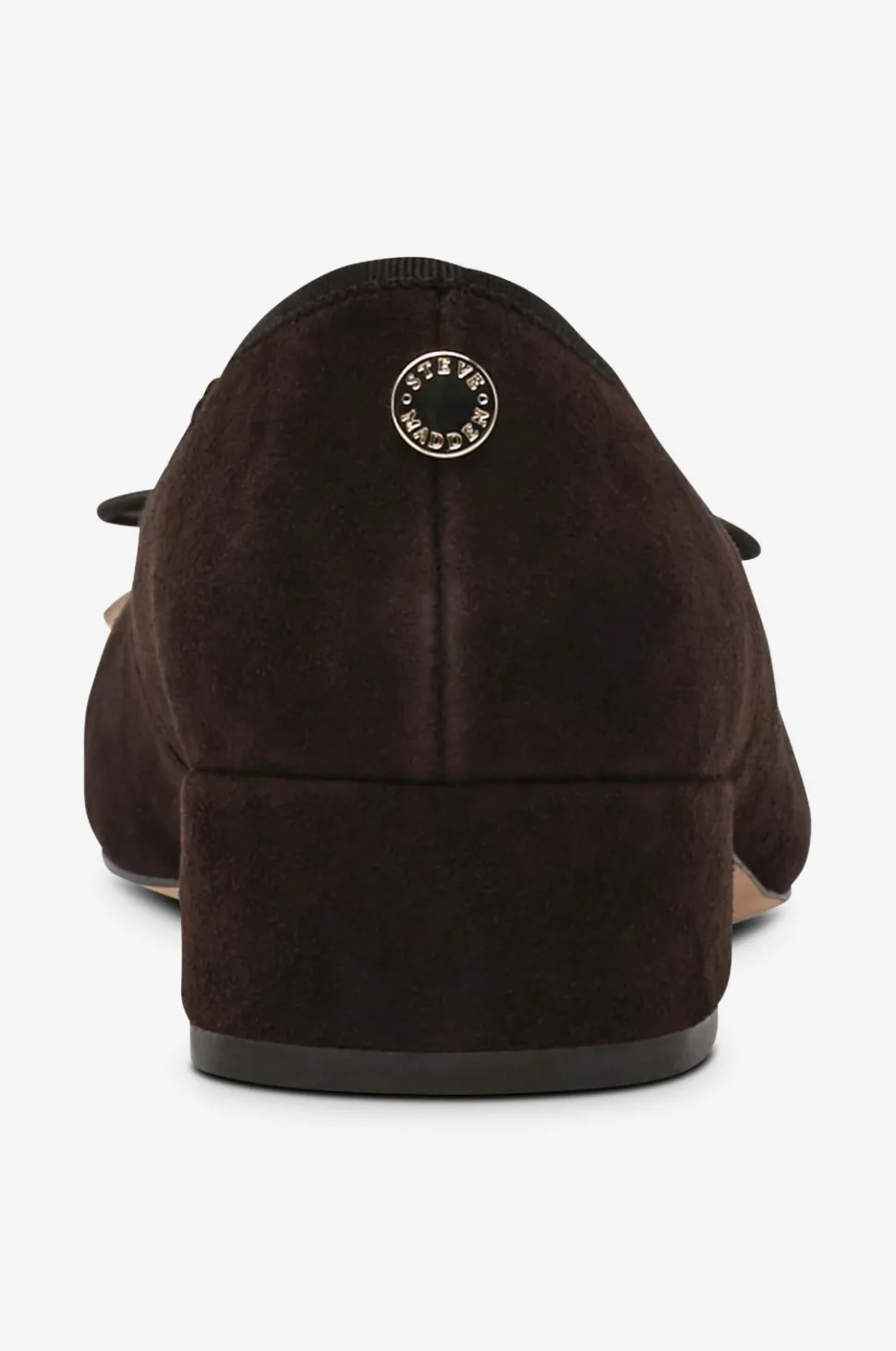 • Ballerinasko med øvredel i ruskind og dekorativ sløjfe foran
