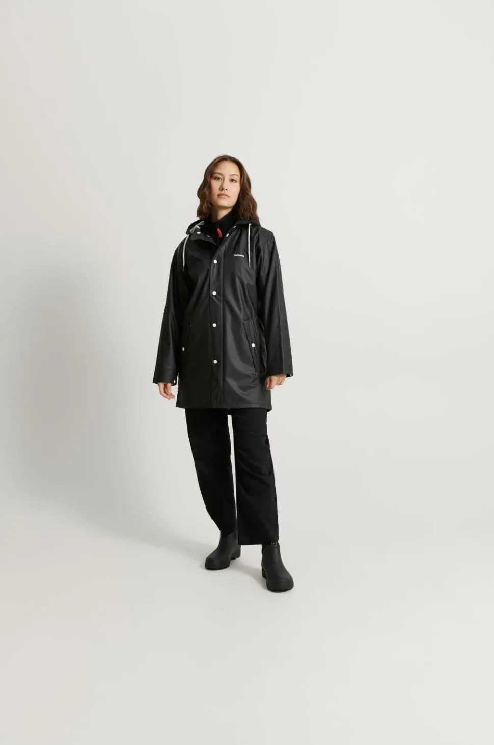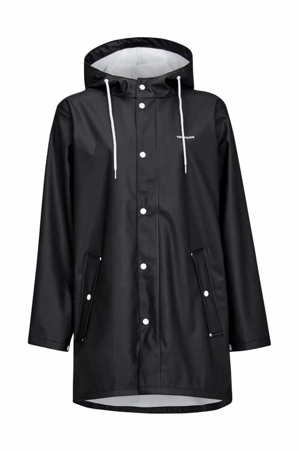 Regnjakke Wings Classic fra Tretorn er en ægte klassiker i unisexmodel. Model er lidt længere med hvide detaljer. Den faste hætte har løbegang med snøre foran. Hvide plasttrykknapper foran og i ærmekanten. To forlommer med flap, der holder vand ude. Jakken, som er helt vandtæt, er fremstillet af PVC-fri PU med varmesvejsede sømme. Længde 90 cm i str. M.