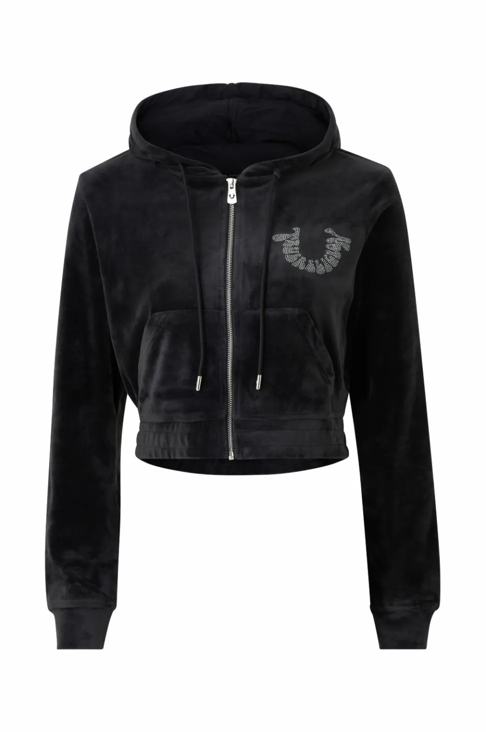 • Hættetrøje i velour med glitrende tekst på brystet og på ryggen