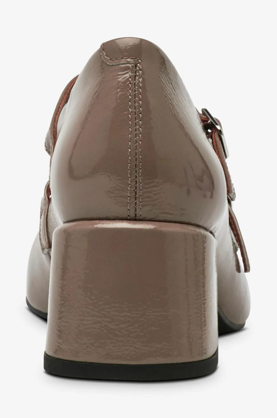 • Højhælet sko i patent læder med beklædt blokhæl