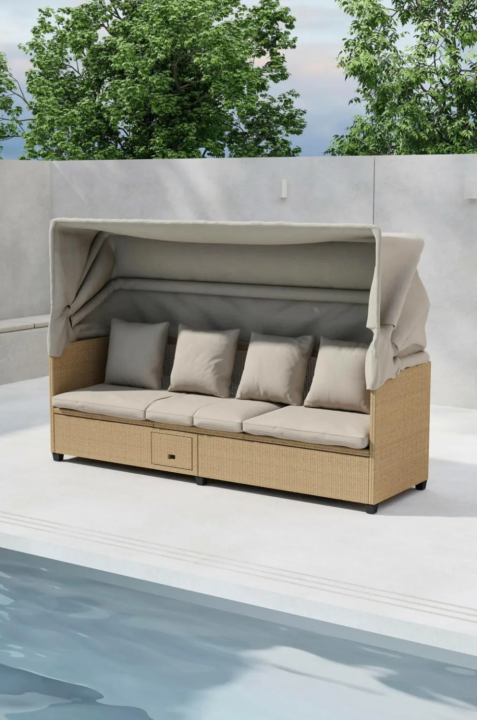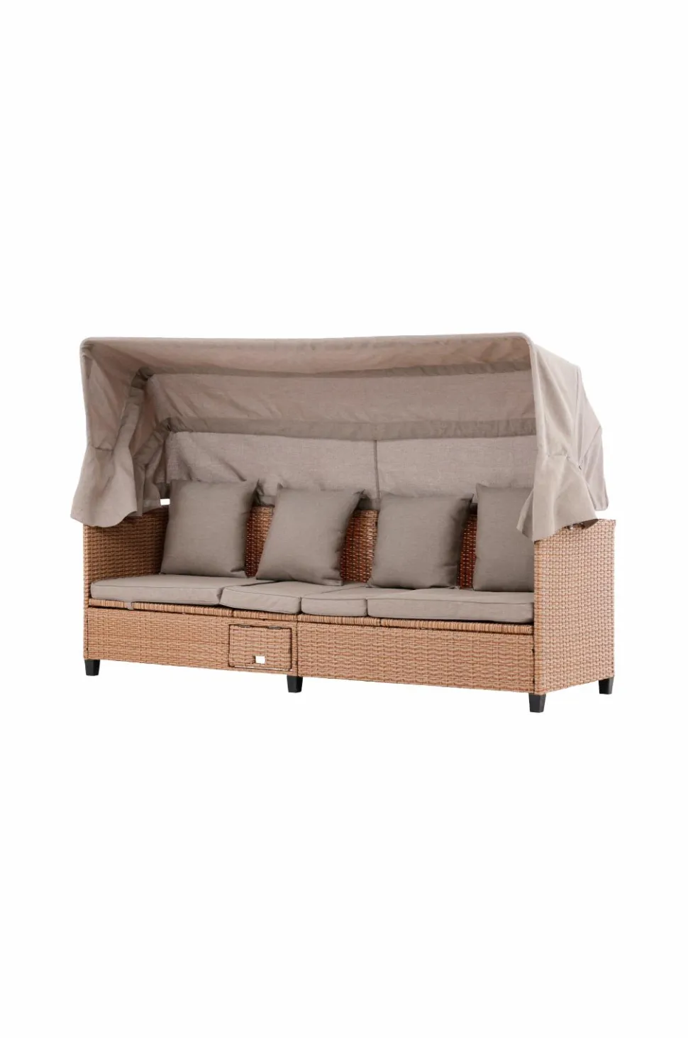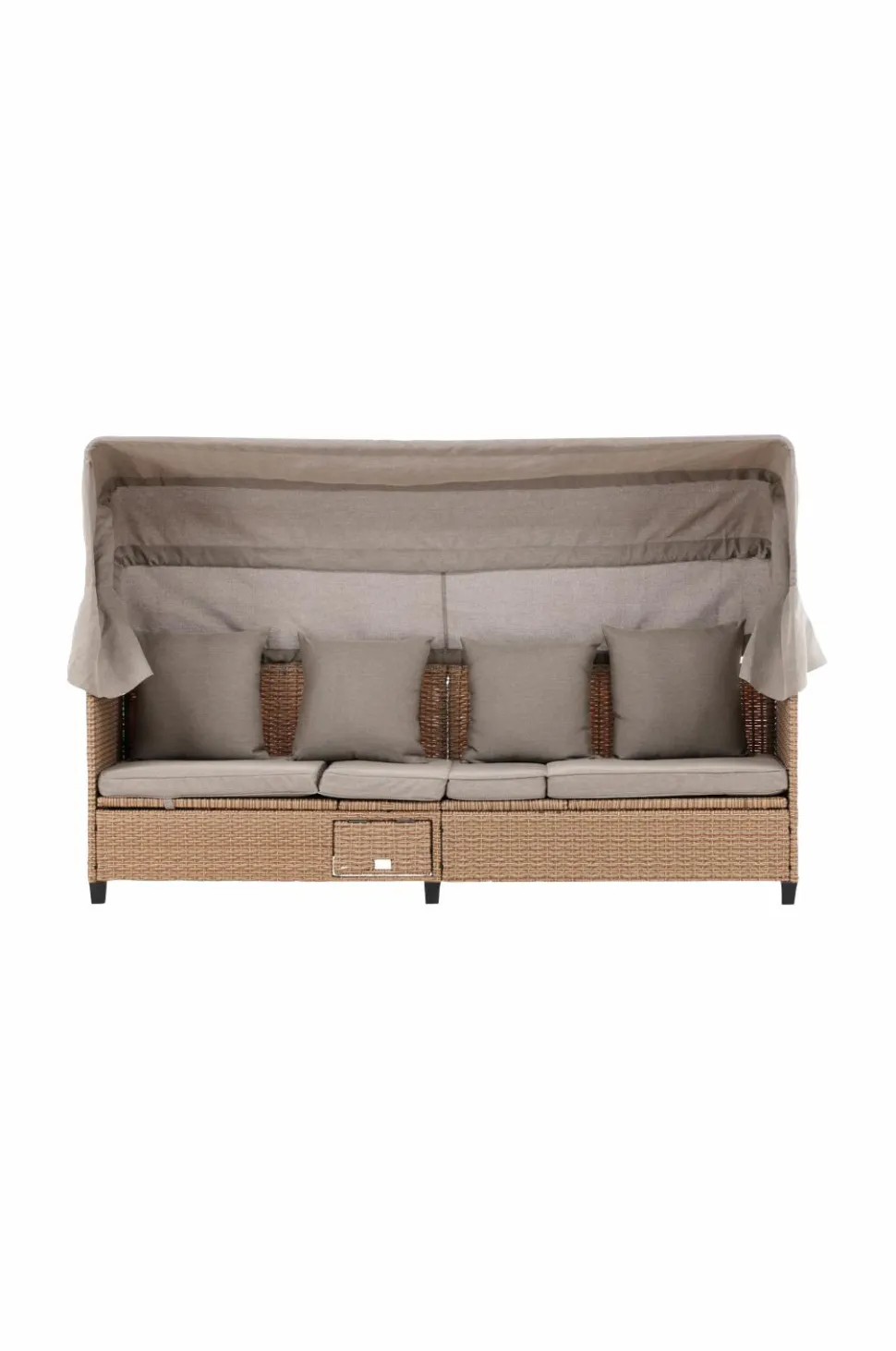 Solvognen fra nopy-serien tager dine afslappende sommerdage til det næste niveau! Fremstillet af sort syntetisk rattan med en justerbar liggesektion for ekstra komfort. Den justerbare parasol i beige polyesterstof giver dig mulighed for nemt at vælge, om du vil ligge i skyggen eller i solen. Bløde, grå, tuftede hynder medfølger for ekstra komfort. Snup en god bog eller nyd en dejlig lur – her kan du sidde eller ligge behageligt i timevis!