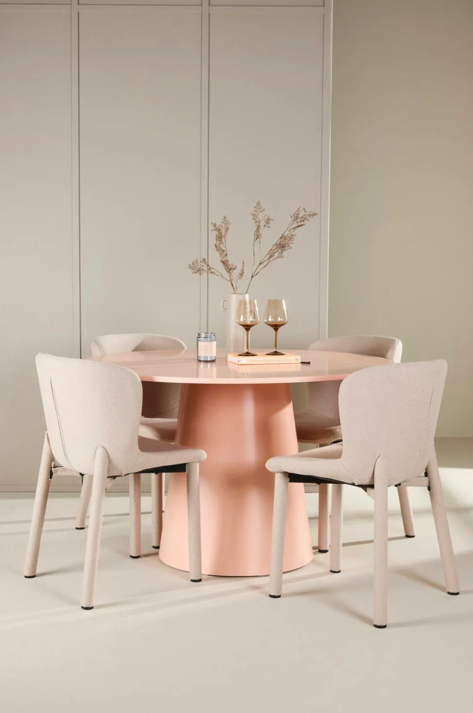 lanzo-spisebordet giver et frisk og moderne touch med sin fantastiske, fint forarbejdede finish. Med en diameter på 120 cm balancerer bordet perfekt mellem funktionalitet og æstetik og danner en ideel ramme om både hverdagsmåltider og festlige sammenkomster. Det ensartede design, der strækker sig over både bordplade og ben, skaber et blødt og harmonisk look, der naturligt tiltrækker sig opmærksomhed som et fokuspunkt i dit hjem. Den runde form indbyder til samvær og gør bordet perfekt til sociale lejligheder og dejlige måltider.