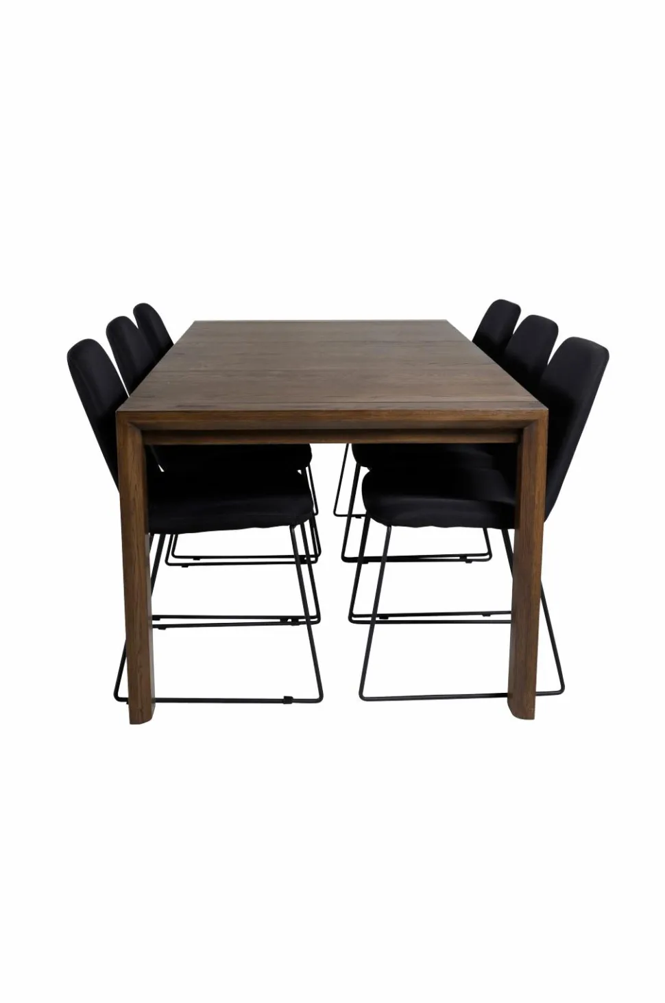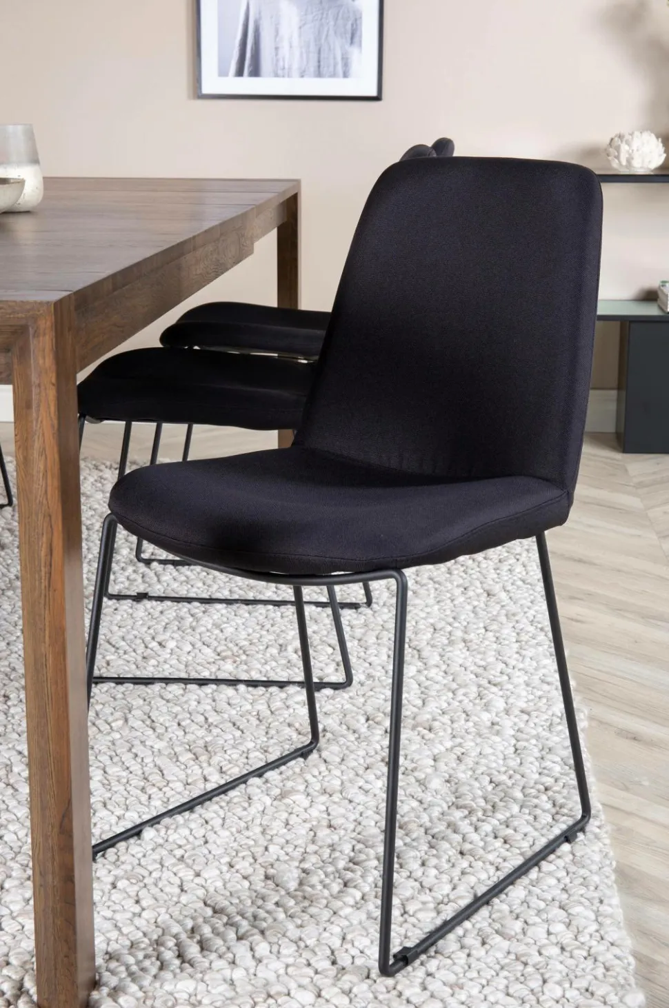 Du behøver ikke at gå på kompromis mellem klassisk og moderne – dette spisebordssæt går aldrig af mode! Spisebordsskyderen med egetræslook imponerer med sit varme og naturlige udseende. Bordet kan forlænges efter behov, og de lige nordiske former skaber et luftigt og moderne helhedsindtryk i rummet. Her i perfekt kombination med spisebordsstole fra muce-serien. Stolen har et stilfuldt, fuldpolstret, minimalistisk design. Det smalle benstativ er lavet af pulverlakeret metal. Ryggen og sædet er betrukket med polyesterstof med blød polstring for ekstra komfort. Sid behageligt og indret smart!
