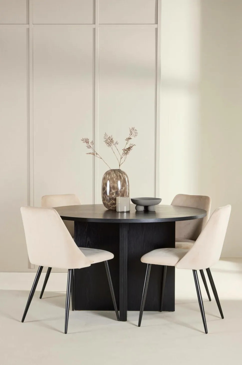 night-spisestolen er betrukket med blødt fløjl, der giver en sofistikeret og indbydende fornemmelse. Dens raffinerede design passer harmonisk ind i forskellige indretningsstile, fra moderne minimalisme til klassisk charme. De slanke ben giver en smuk kontrast og skaber en stabil og elegant profil. Med sit ergonomiske design og behagelige sæde er night perfekt til lange middage og hyggelige stunder omkring bordet.