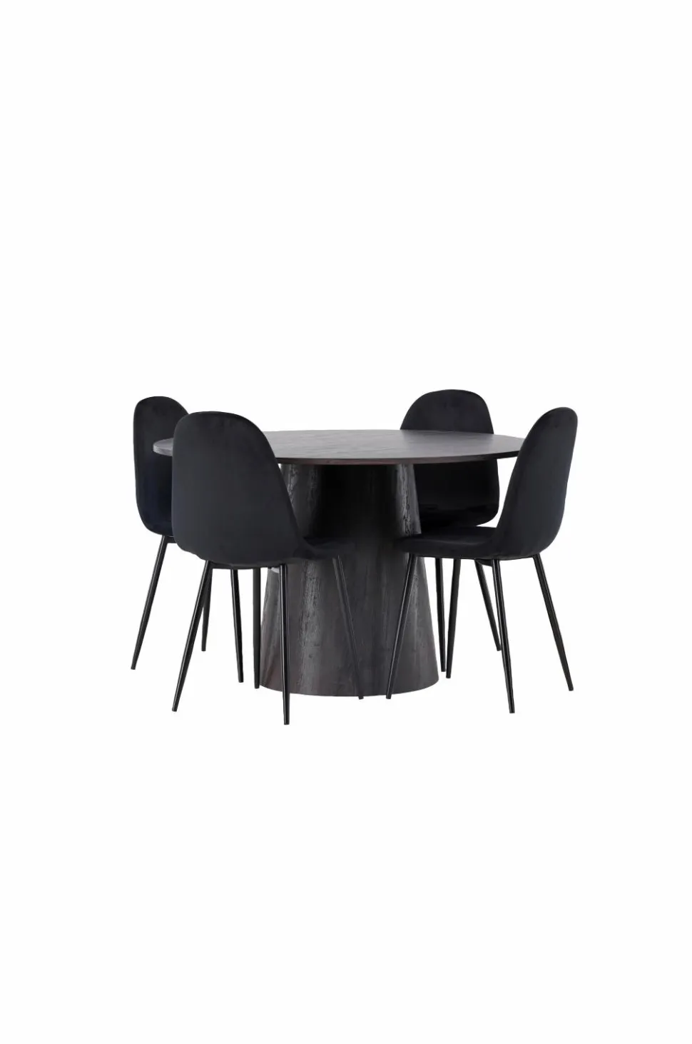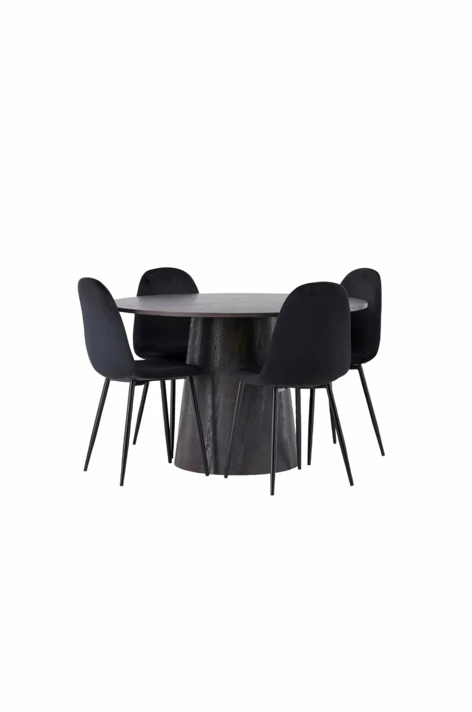 Her kommer ingen til at sidde ved kanten! Venture Designs vidunderlige, runde spisebord Lanzo har et gennemgående helhedsdesign i MDF med en tynd bordplade og et snoet cylinderformet stel, der er centreret under midten af bordet. Her i flot kombination med spisebordsstole fra serien Polar. Stolen har et fuldpolstret design, ben i pulverlakeret metal og afrundet ryg og sæde i velourstof med blød polstring. Saml dine kære til hyggelige måltider!