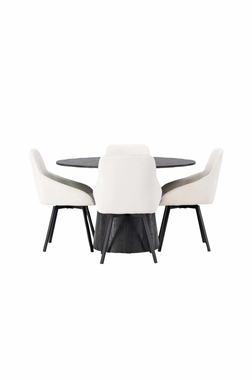 En behagelig spisegruppe i bløde toner! Venture Designs vidunderlige, runde spisebord Lanzo har et gennemgående helhedsdesign i MDF med en tynd bordplade og et snoet cylinderformet stel, der er centreret under midten af bordet. Her i stilren kombination med vores stole fra serien Rosie. Stolen har et fuldt betrukket sæde med integrerede stofarmlæn og let skrå stoleben i metal. Det bløde sæde er polstret for ekstra komfort og inviterer dig til lange behagelige middagsstunder.