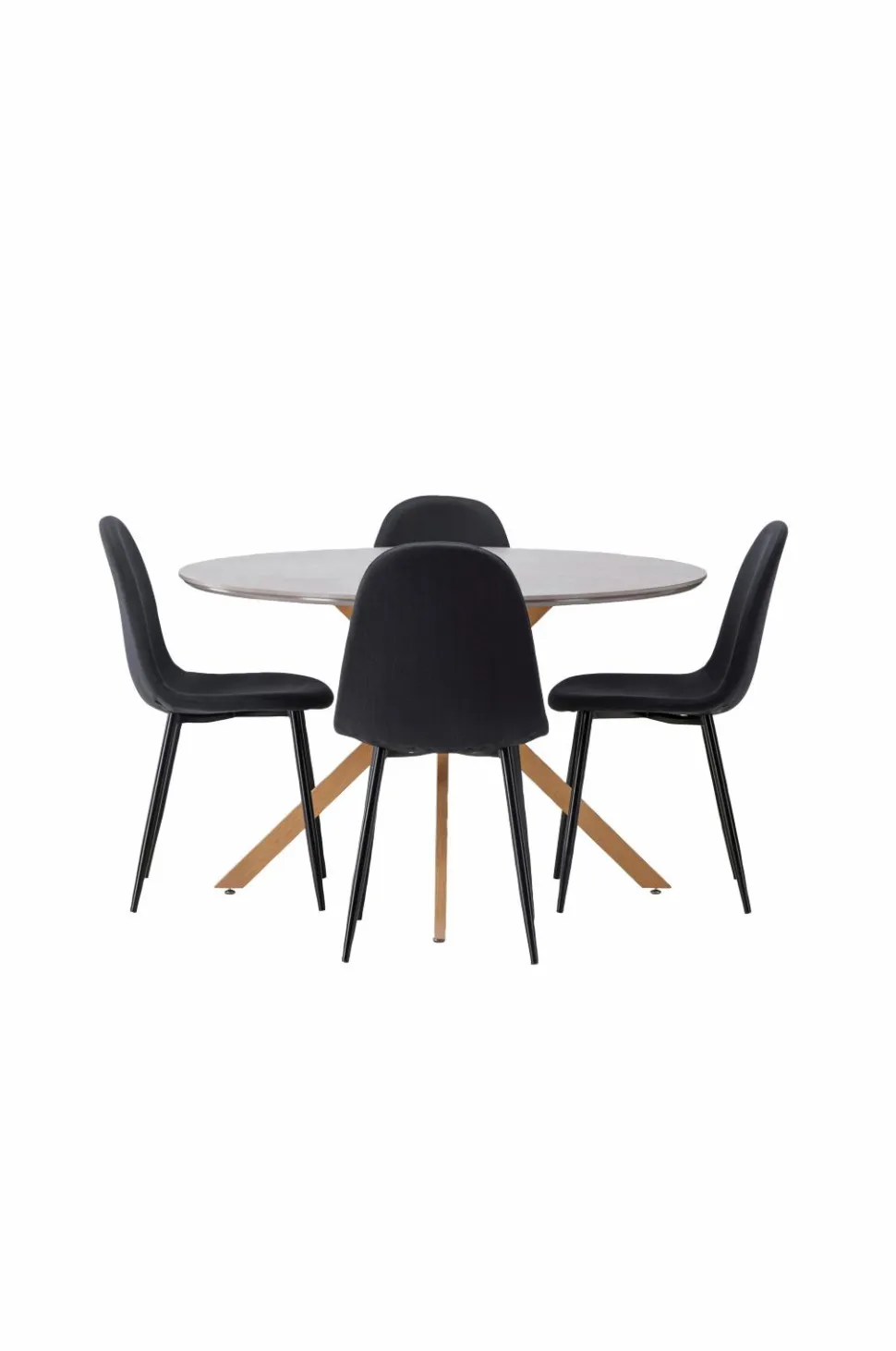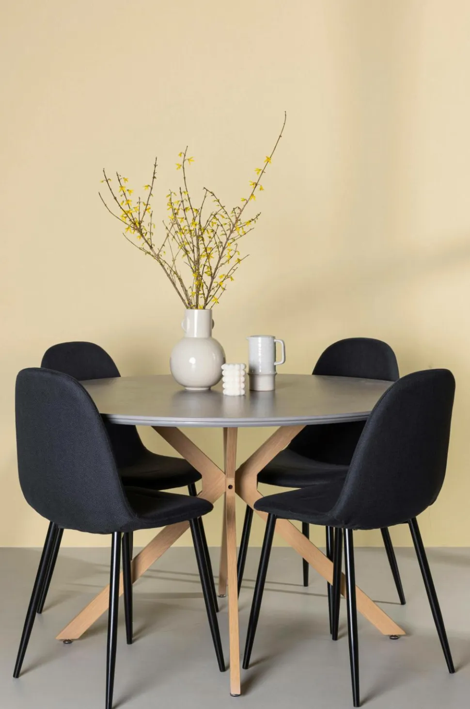 polar stolene er designet til optimal komfort med deres polyesterbetræk og robuste stålben. Stolenes sorte farve skaber en stilfuld kontrast til det grå bord. Hver stol er designet til at give en behagelig siddeoplevelse under lange måltider og samtaler.