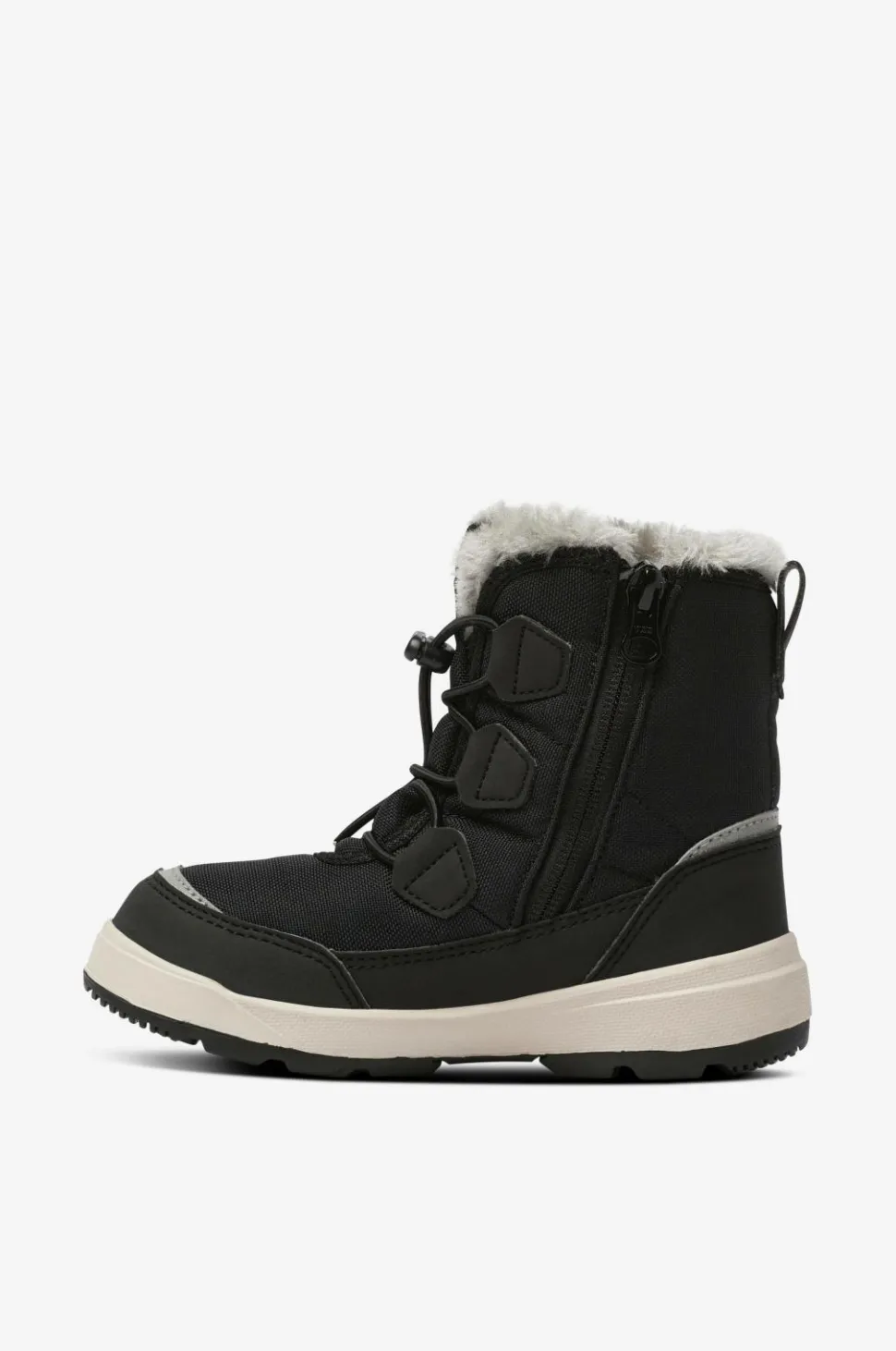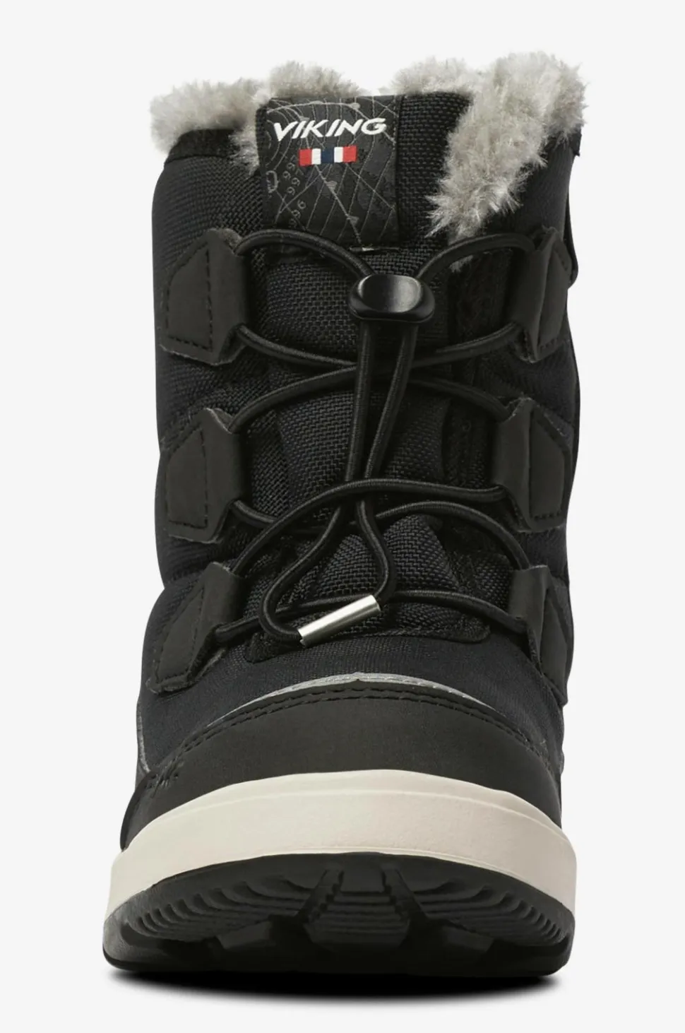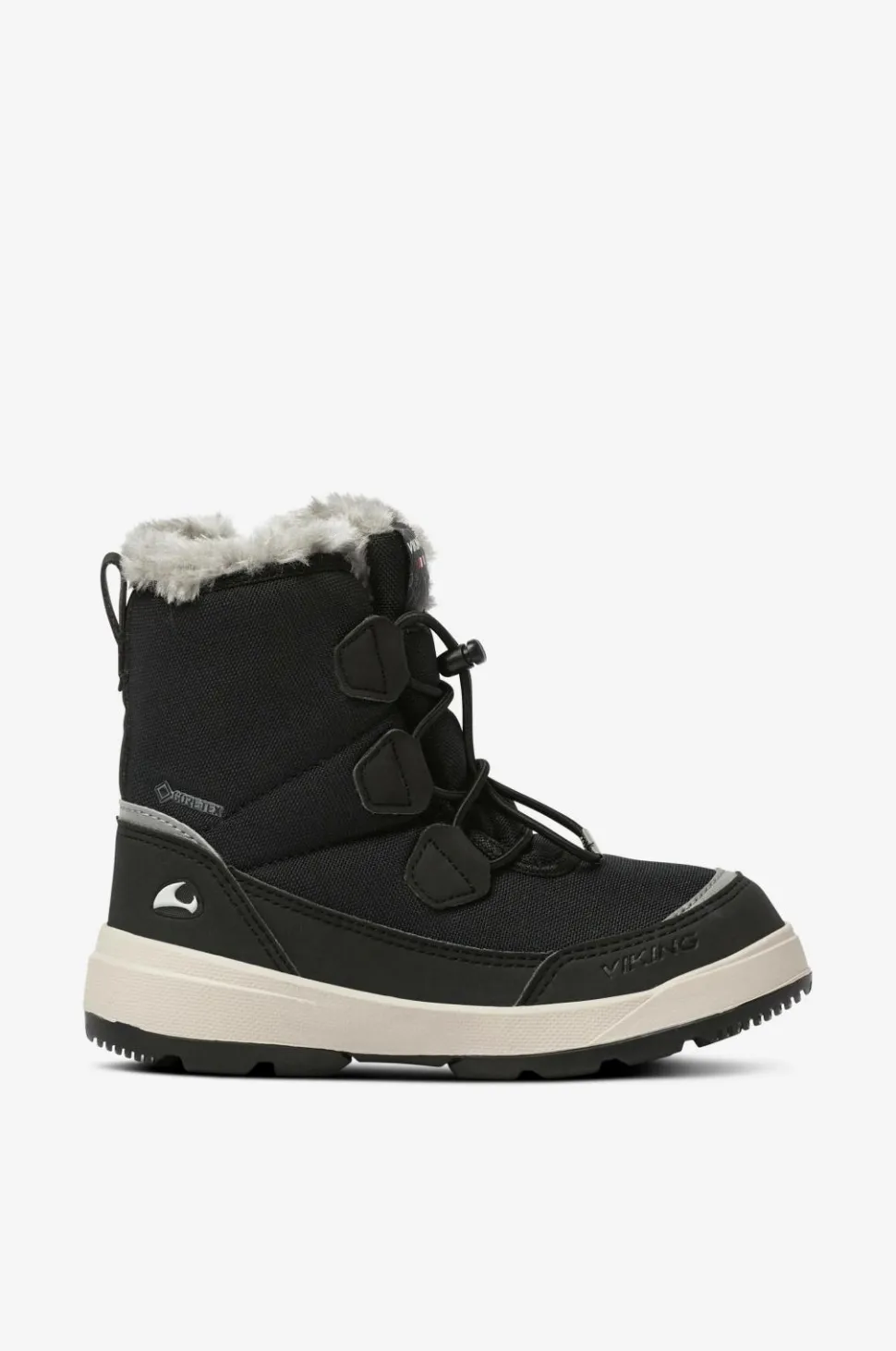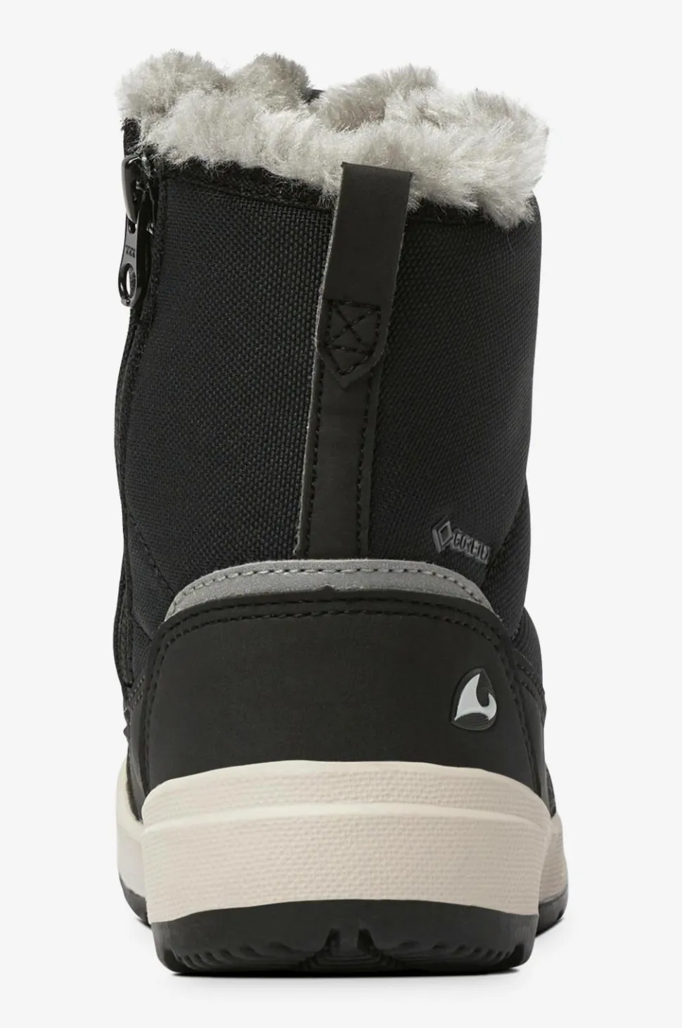 Vinterstøvler Montebello GTX fra Viking er varmforet med blød kunstpels og vandtætte med åndbar GORE-TEX-membran. Overdel i tekstil og syntet. Elastisk quicksnøre med stop og lynlås på indersiden af skaftet. Strop bag på skaftet. Udtagelig indersål. Grebssikker og slidstærk ydersål i gummi.