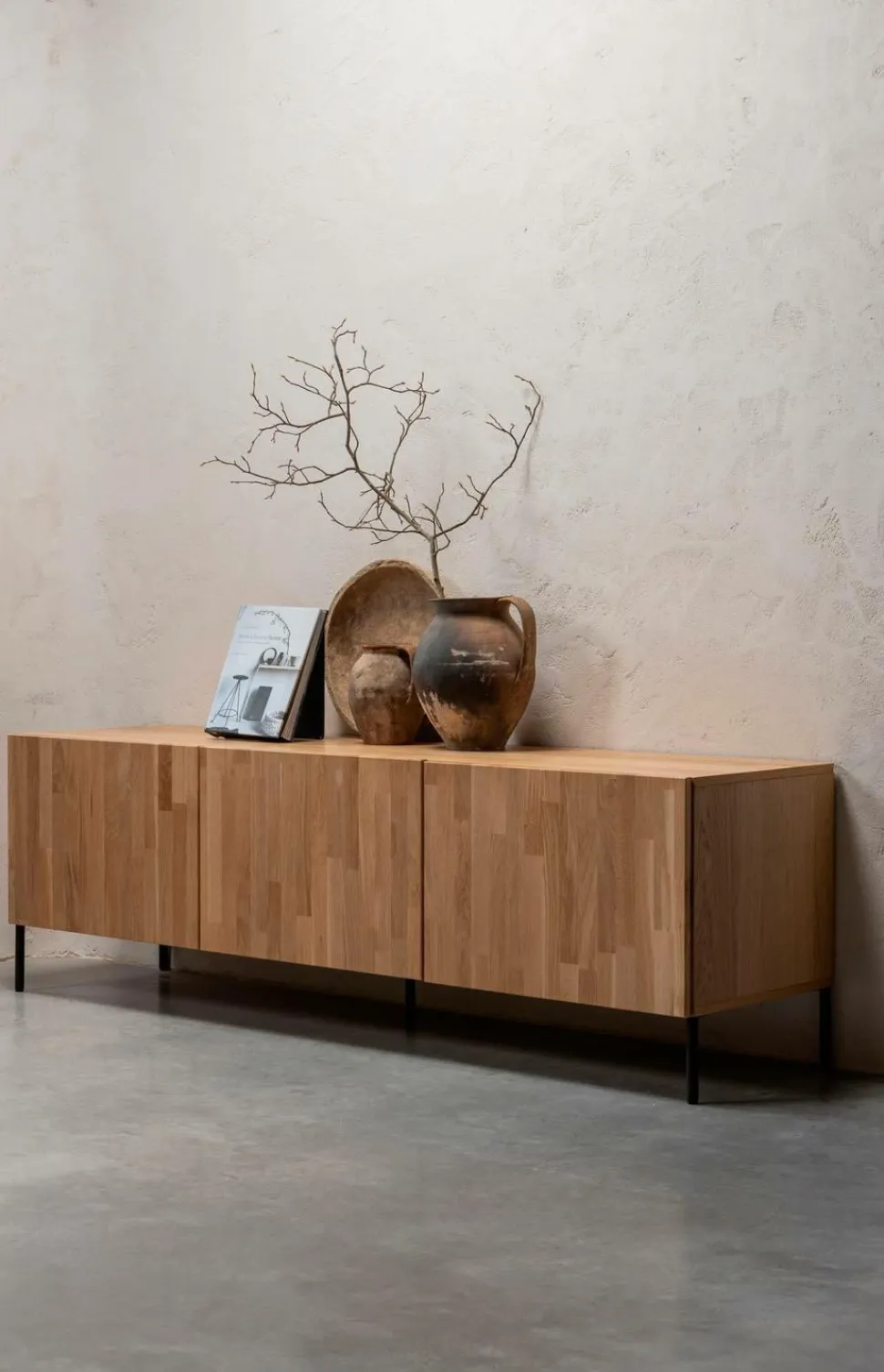 et tidløst design, en varm naturlig træfarve og generøs opbevaringsplads: det er kendetegnene for Bono tv-skabet. Det er en stilfuld tilføjelse til ethvert interiør fra den hollandske interiørdesignmærke WOODs kollektion. Dette tv-skab er lavet af egetræ og har en bejdset finish, så der kan være forskelle i farve og årer. Det gør hvert møbel unikt! Bag de tre skabsdøre tilbyder møblet masser af opbevaringsplads. Det indre rum er smart opdelt med en hylde, så du nemt kan opbevare dit medieudstyr, tilbehør og andre vigtige ting.