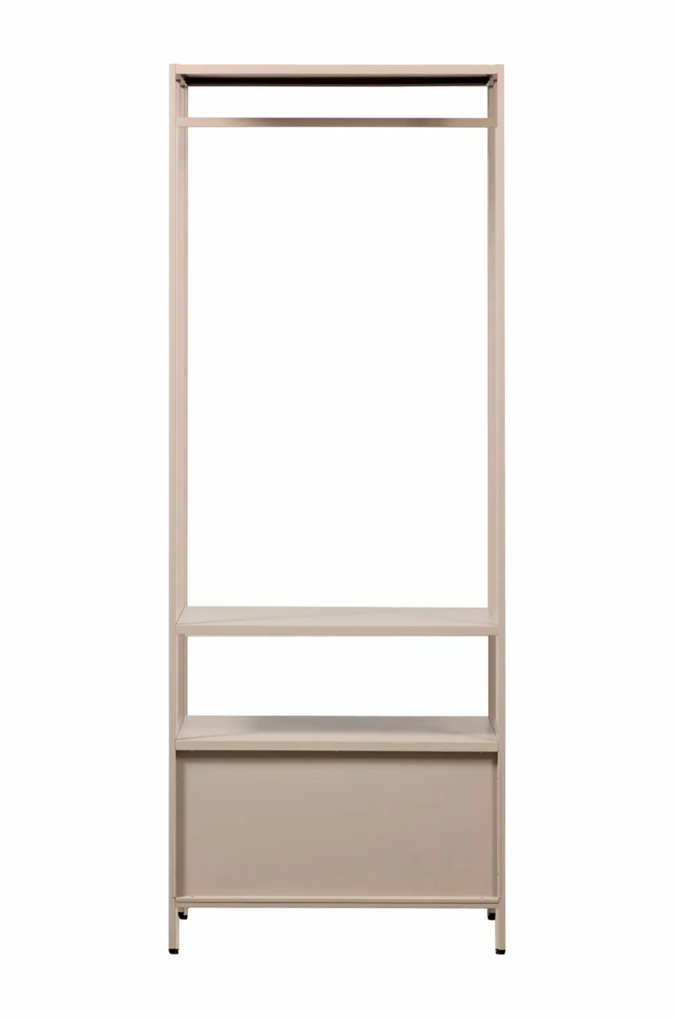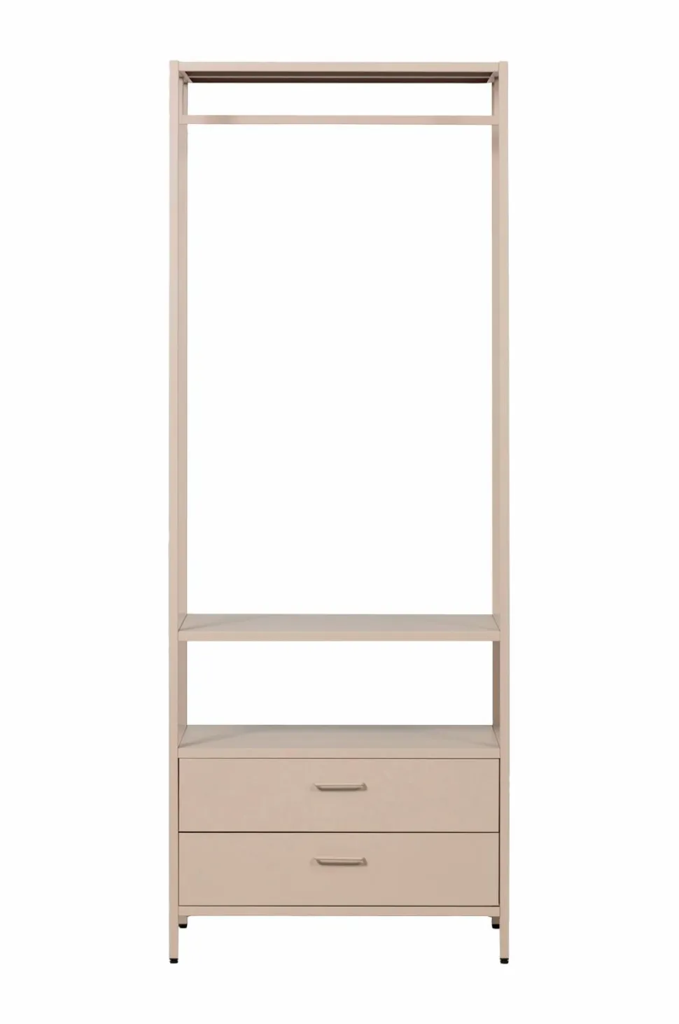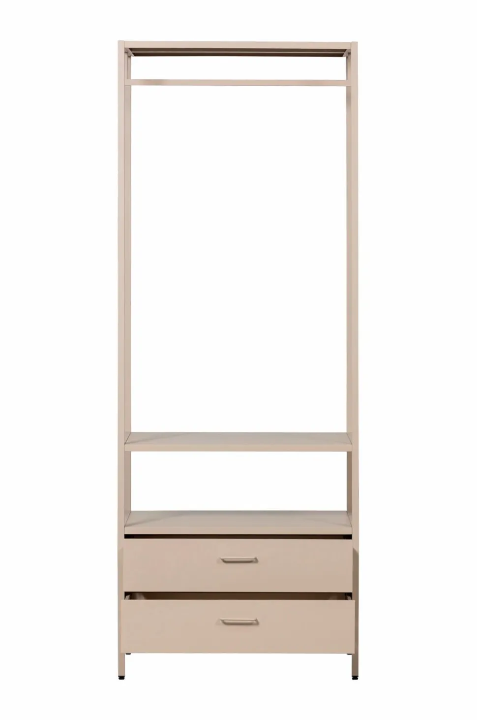 Med Ferris-garderoben behøver du ikke længere lade tøj ligge og flyde. Takket være det åbne tøjstativ har du altid overblik over dine yndlingsoutfits. Garderoben har to rummelige skuffer, der er perfekte til opbevaring af undertøj, tilbehør eller andet tøj. Det stilfulde design passer ind i ethvert soveværelse eller walk-in-closet og tilbyder masser af opbevaringsplads!