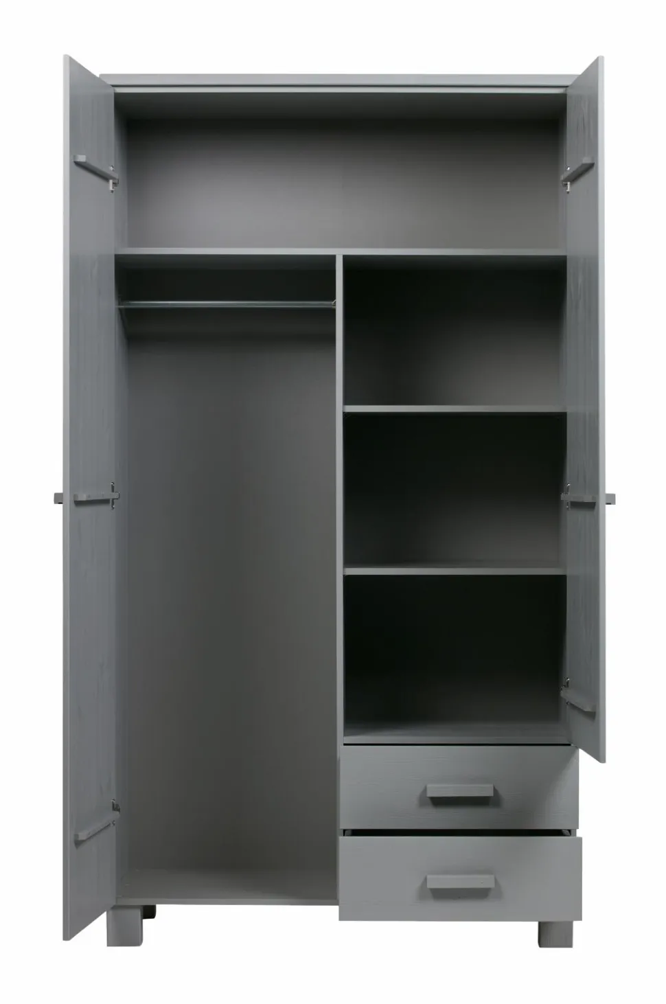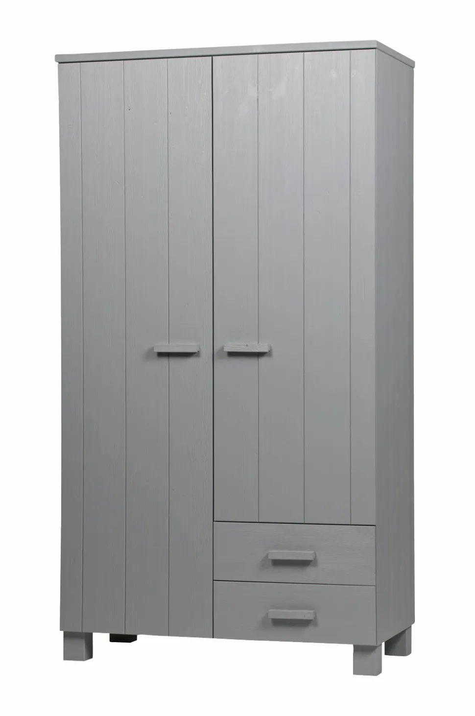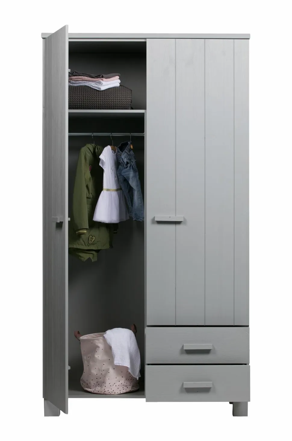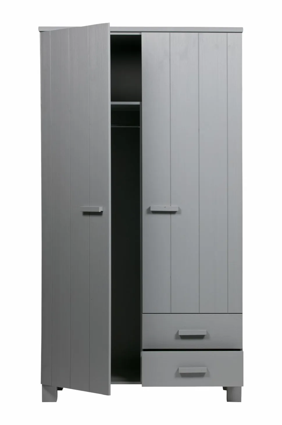 Garderobeskabet Dennis er robust og smart. Dette solide skab kan både hænge eller stå på ben. I fyrretræ med en børstet finish og malet grå. Lågerne har lodrette v-riller. Melamin indvendigt og en bred hylde i toppen, derunder en delt stang til venstre og til højre tre delte hylder og 2 skuffer.