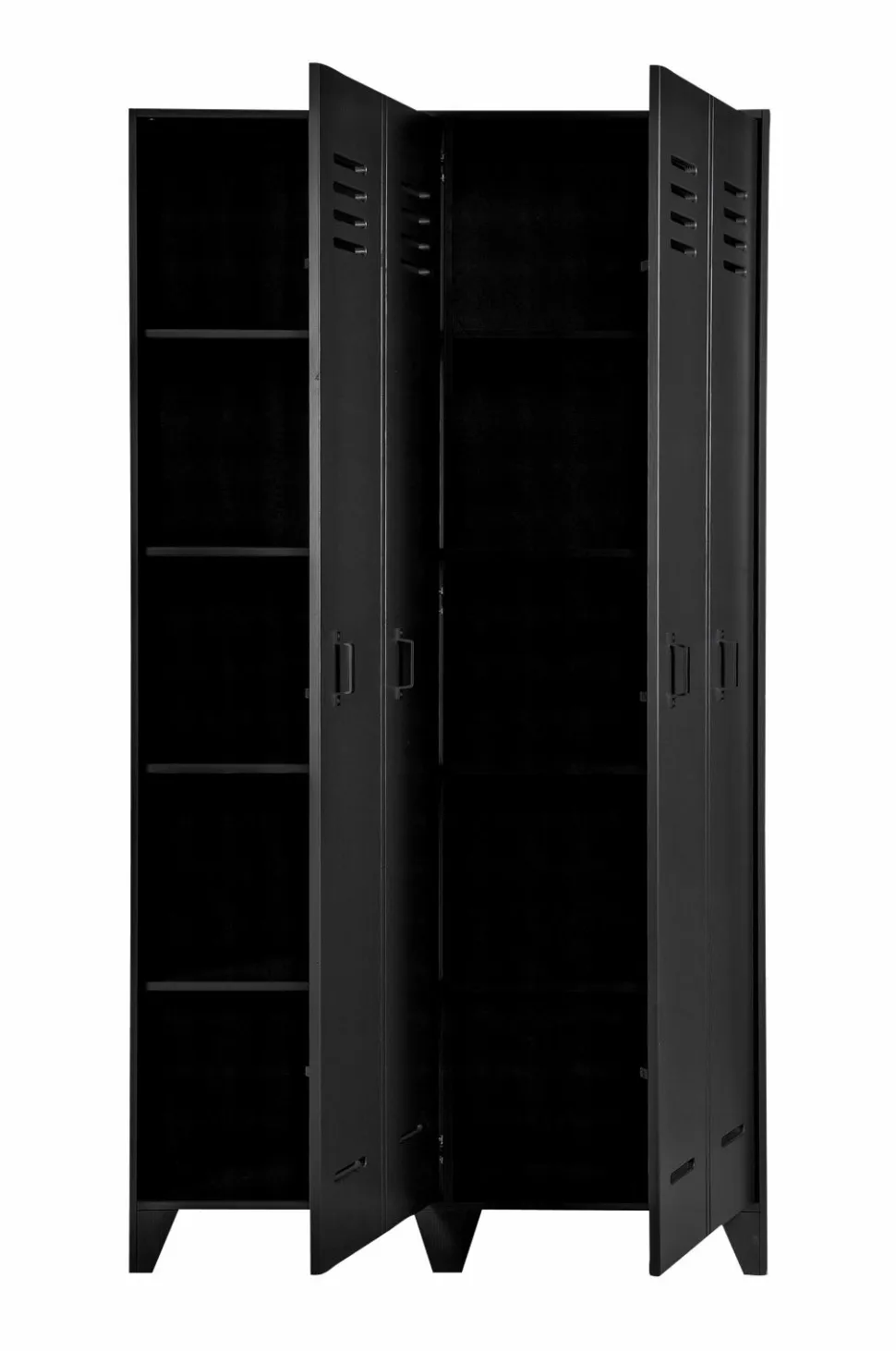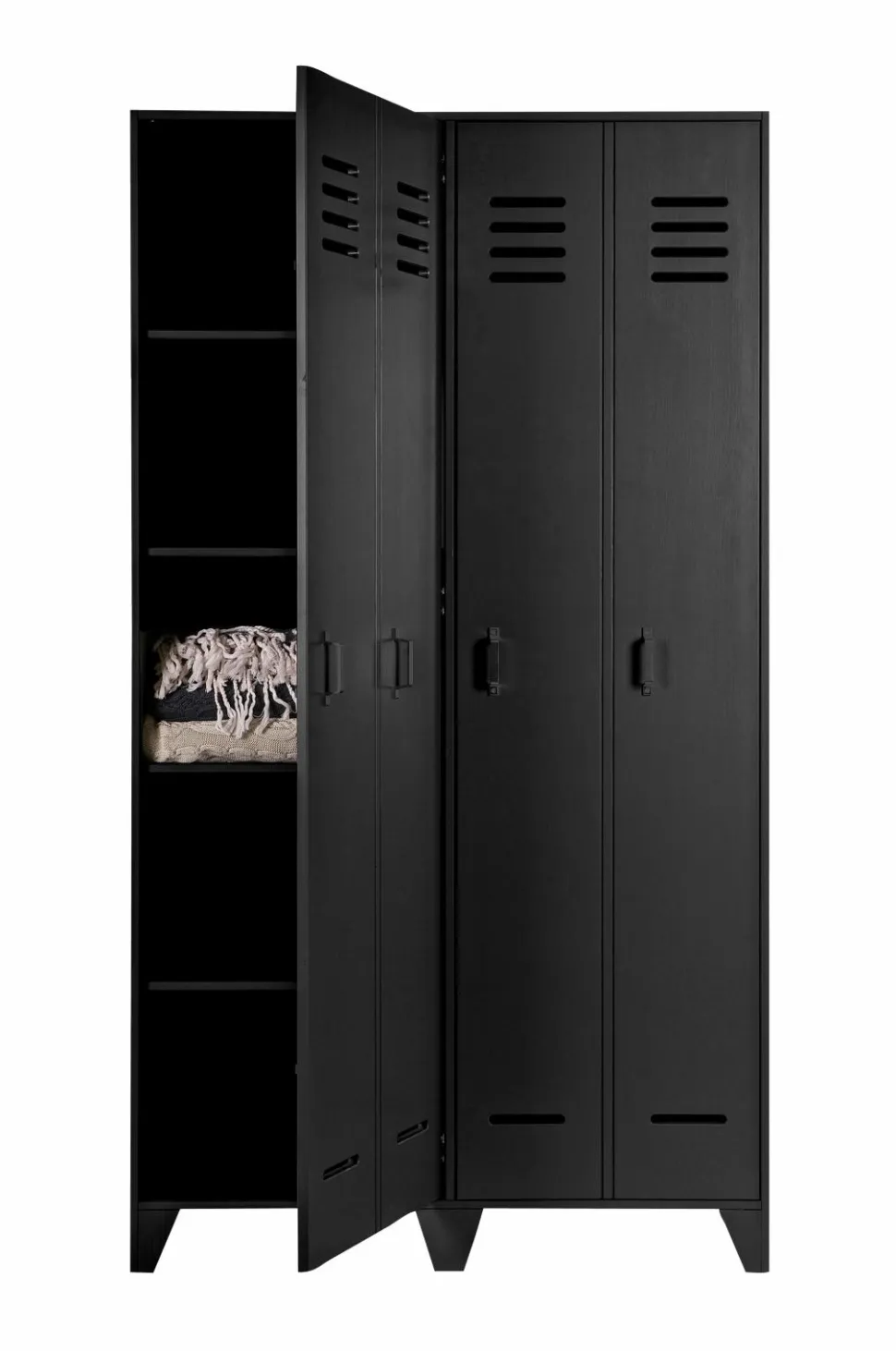 Stijn er en ny serie garderobeskabe fra WOOOD. Det er et robust garderobeskab fremstillet i massivt fyrretræ. Det rummelige garderobeskab med to låger giver god opbevaring. Fire monterede hylder bag hver låge. For at give en fin effekt ser det ud som om skabet har fire låger, men af praktiske årsager er det to større låger. Dette garderobeskab er perfekt til soveværelset, men også meget trendy til f.eks. kontoret.
