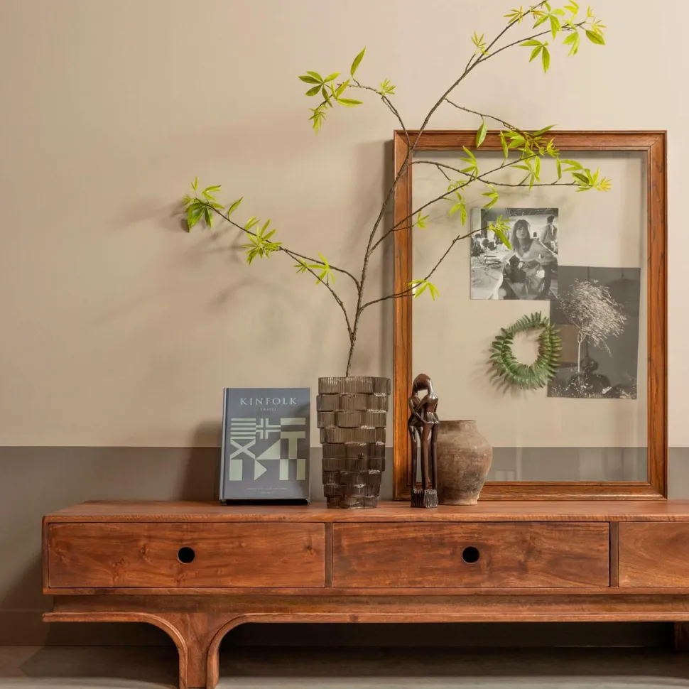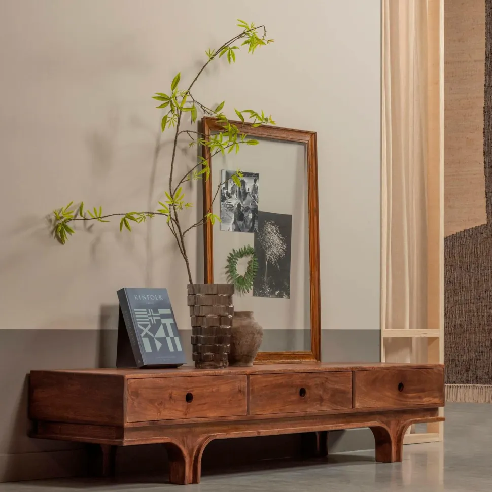 de legende linjer i basen og mangotræet sikrer, at staes tv-skabet er en klassisk, attraktiv tilføjelse til indretningen. Tv-skabet er en del af den eksklusive kollektion fra det hollandske interiørmærke woood og har tre skuffer til opbevaring af ting. Årerne og knasterne i mangotræet gør staes tv-skabet til et autentisk element i din indretning.