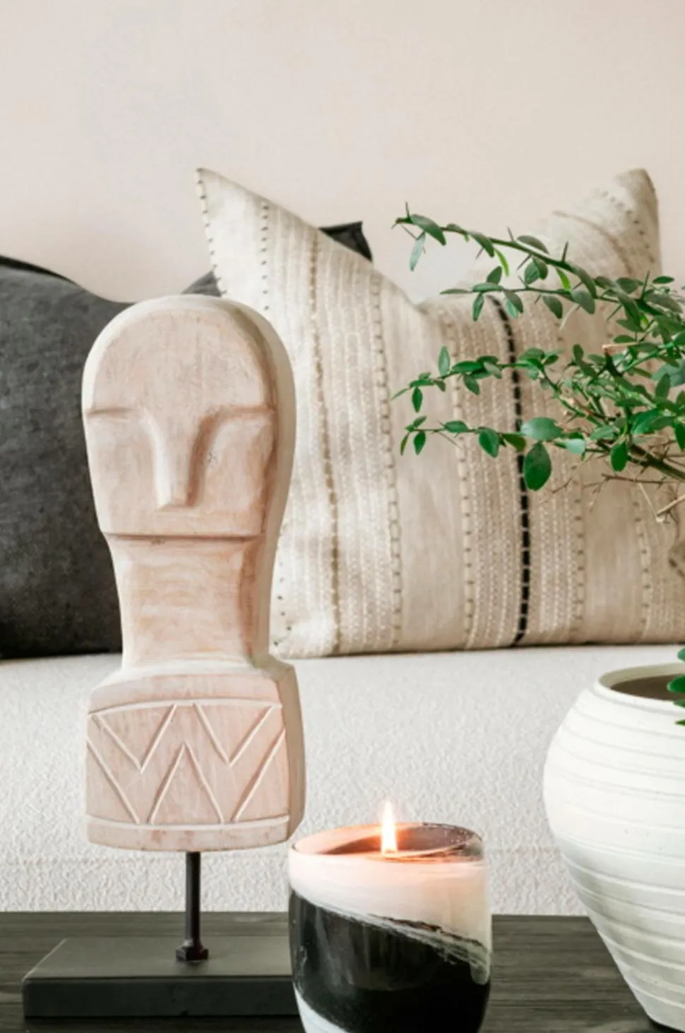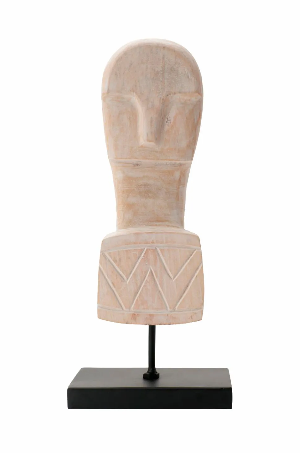Statue i hvidkalket træ med sort metalbase