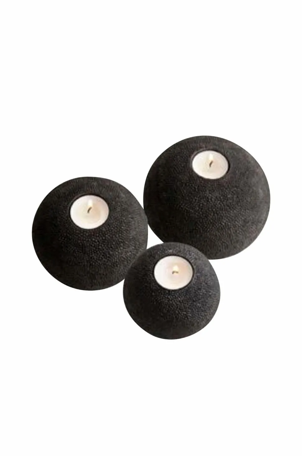 Sæt/3 kugleformede lysestager fremstillet i slidstærkt polyresin.